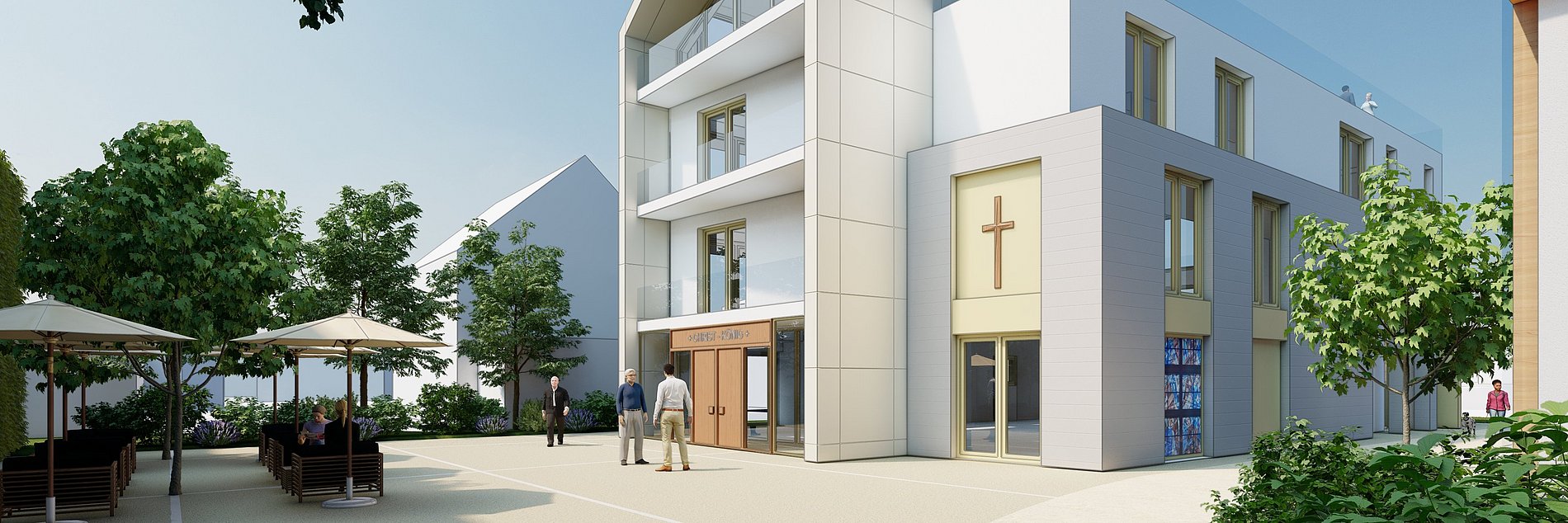 Geplant sind 52 Wohnungen – davon 37 in einer Seniorenresidenz und 15 im freien Wohnungsbau – ergänzt durch Tagespflege, Physiotherapie, ein Café mit Bäckerei, Gewerbefläche sowie gemeinschaftliche Flächen. Herzstück des Quartiers bildet ein zentraler Platz, der die Bewohner mit der Kirchengemeinde und Besuchern zusammenführt. Das neue Gemeindezentrum bietet flexible, barrierefreie Räume für neue pastorale Formate und Angebote sowie Gottesdienste, Begegnungen und Veranstaltungen.