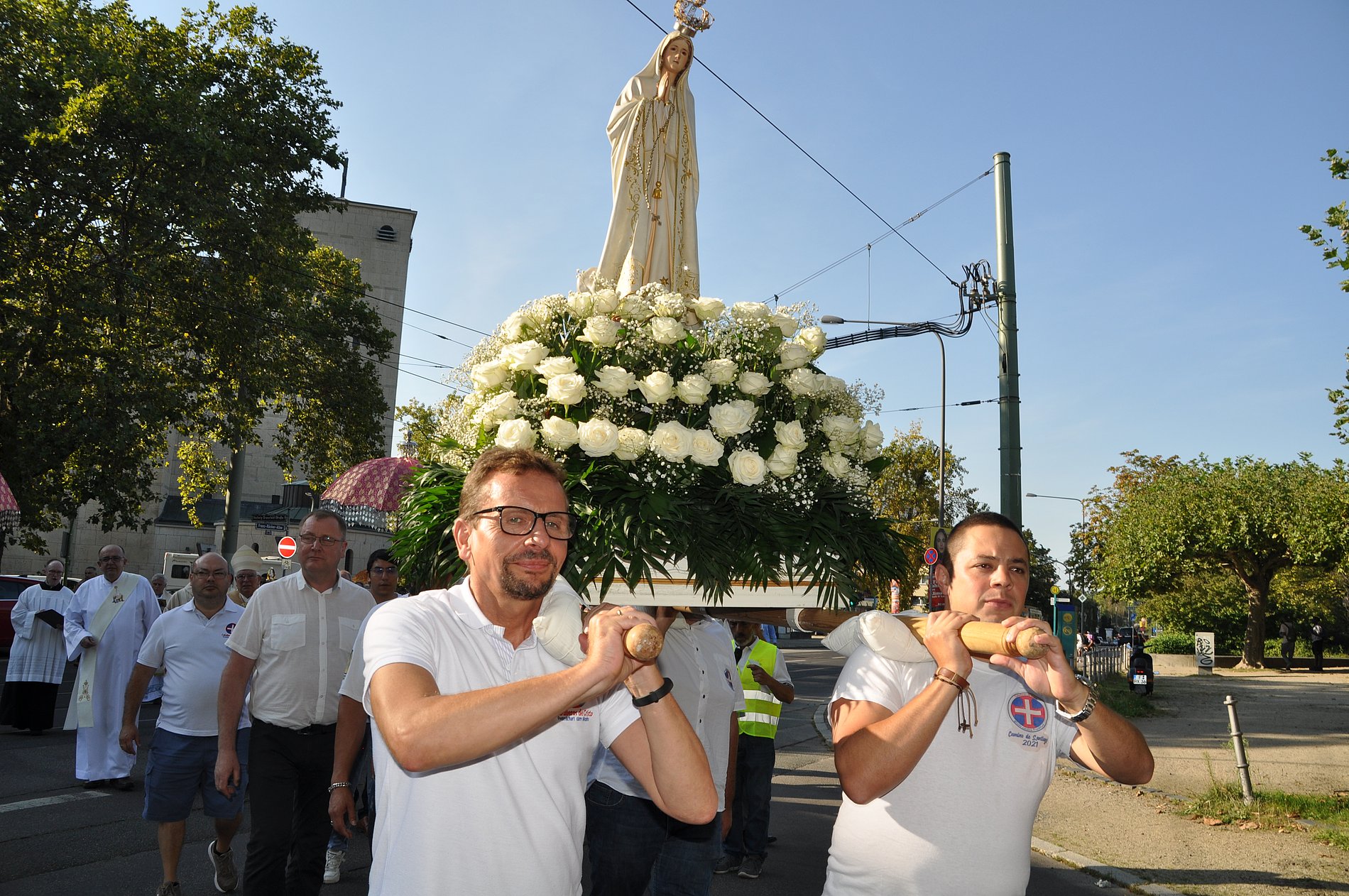 Das kleine weiße Kissen auf der Schulter half etwas, aber schwer war die mit Rosen geschmückte Marienstatue dennoch. „Um die 100 Kilo“, schätzte Oliver Schlarb von der spanischsprachigen Gemeinde in Frankfurt, wiege die Muttergottes, die von ihm und drei weiteren Trägern auf einem Podest bei 30 Grad in einer feierlichen Prozession durch die Straßen rund um die Frauenfriedenskirche in Bockenheim getragen wurde. Immerhin, nach der Hälfte der Strecke wurden die Männer abgelöst – und konnten so doch noch ein paar Lieder mitsingen.