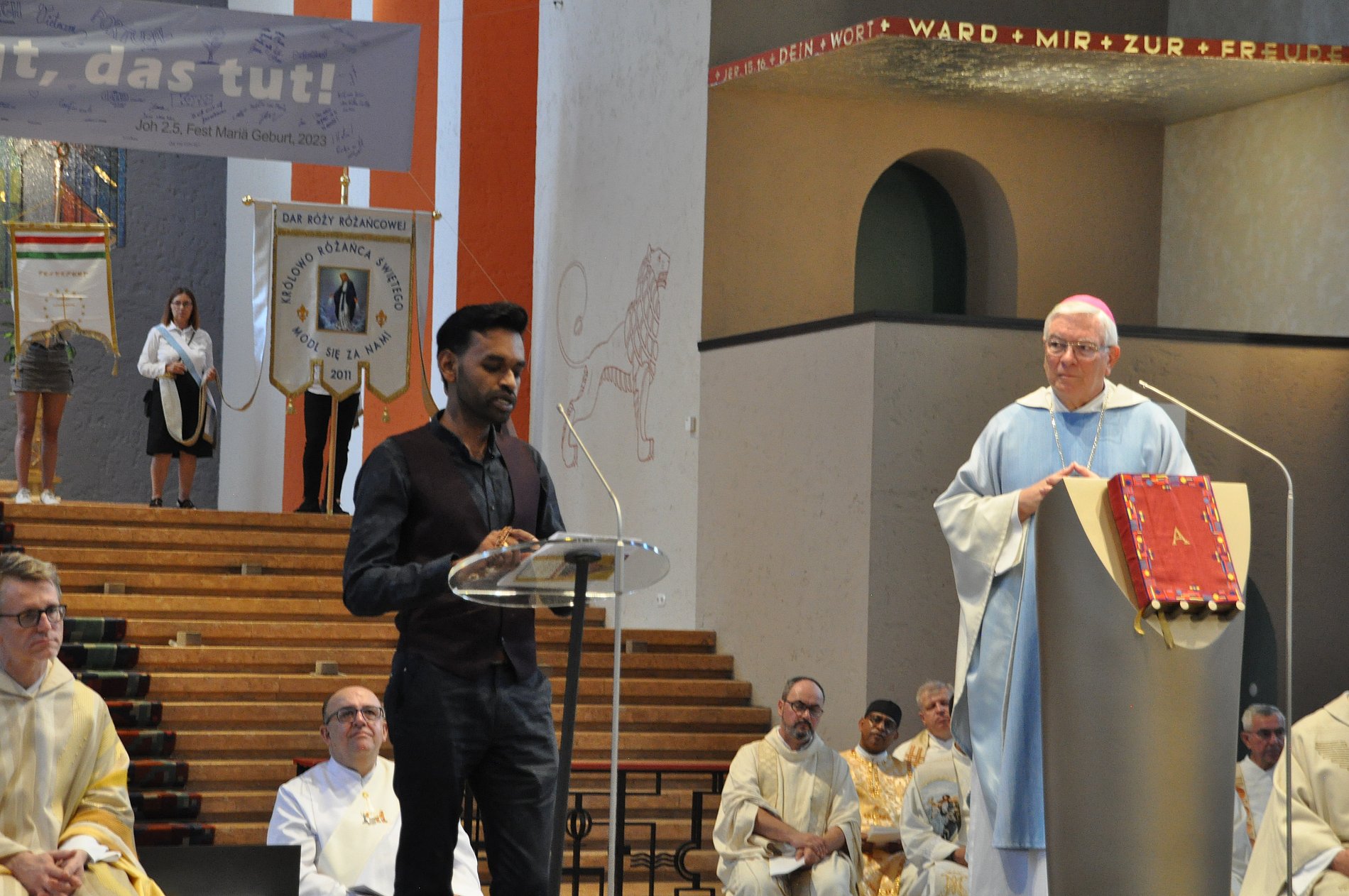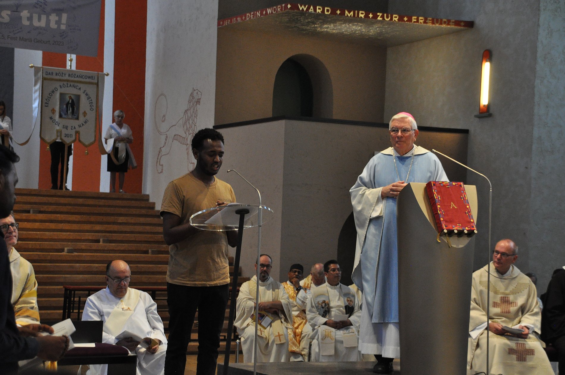 Zum zehnten Mal haben die muttersprachlichen Gemeinden und Pfarreien des Bistums Limburg Mariä Geburt mit dem festlichen Gottesdienst „Mutter aller Völker“ in Frankfurt gefeiert. Die Frauenfriedenskirche war beim Gottesdienst mit Weihbischof Thomas Löhr so voll besetzt, dass zahlreiche Besucherinnen und -besucher im hinteren Teil der Kirche stehen mussten. „Froh und ein bisschen stolz“ sei er, dass die Frauenfriedenskirche in den vergangenen zehn Jahren immerhin sieben Mal Ort dieser wunderbaren Demonstration des Glaubens gewesen sei, sagte Joachim Braun, Pfarrer der gastgebenden Pfarrei St. Marien. Drei mal musste der Gottesdienst wegen der umfangreichen Renovierung von Frauenfrieden ausweichen und in der Niederräder Kirche „Mutter zum Guten Rat“ gefeiert werden; nun ist er seit drei Jahren zurück in Bockenheim. Braun überbrachte auch Glückwünsche von Stadtdekan Johannes zu Eltz, der nicht persönlich dabei sein konnte. „Vom Dom her denke ich heute an Sie alle und an Ihre Gemeinden anderer Muttersprachen im Bistum. Maria, die Mutter aller Christen, aller Menschen hat an solchen Verbindungen Freude“, lautete seine Grußbotschaft.