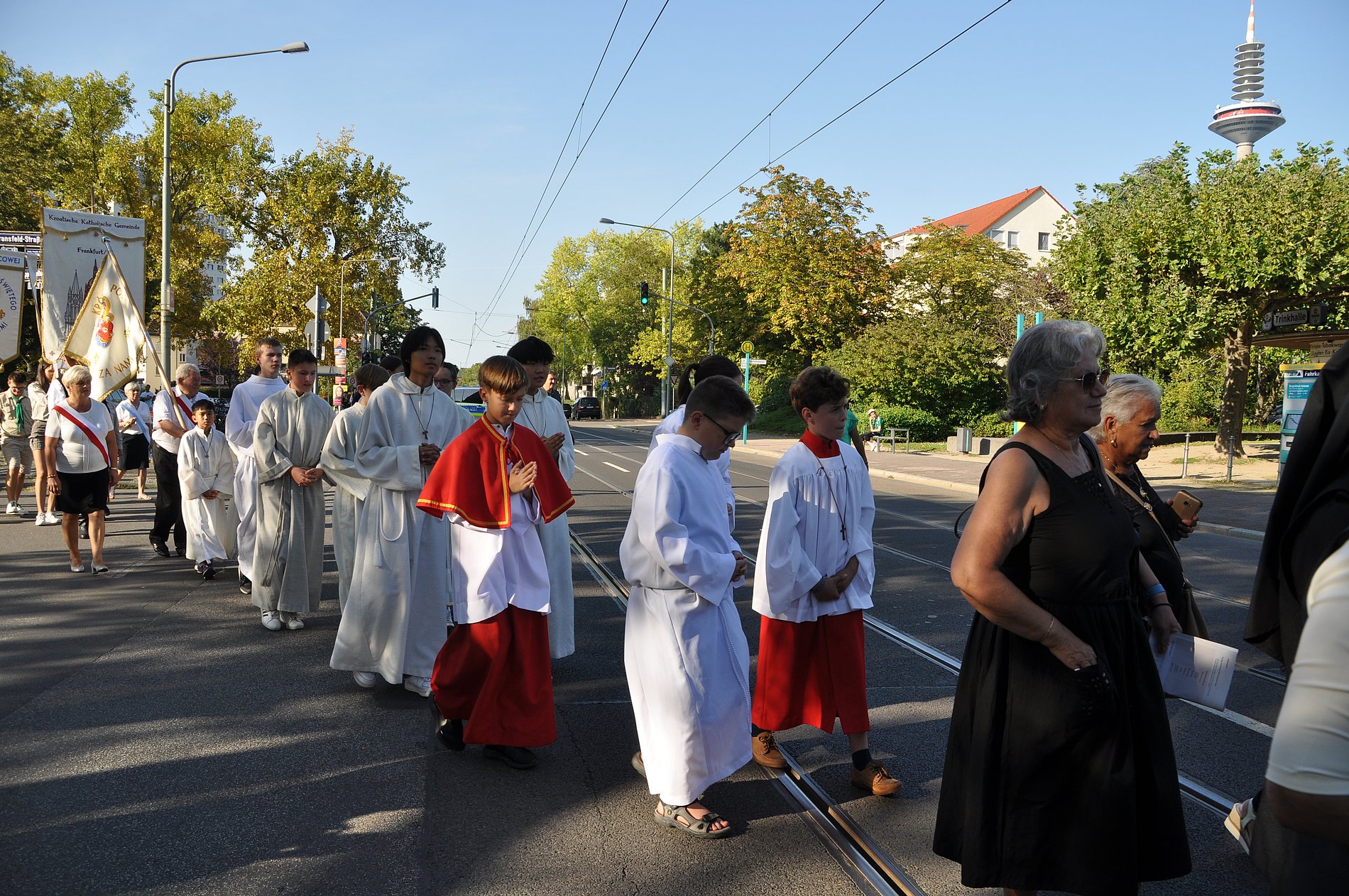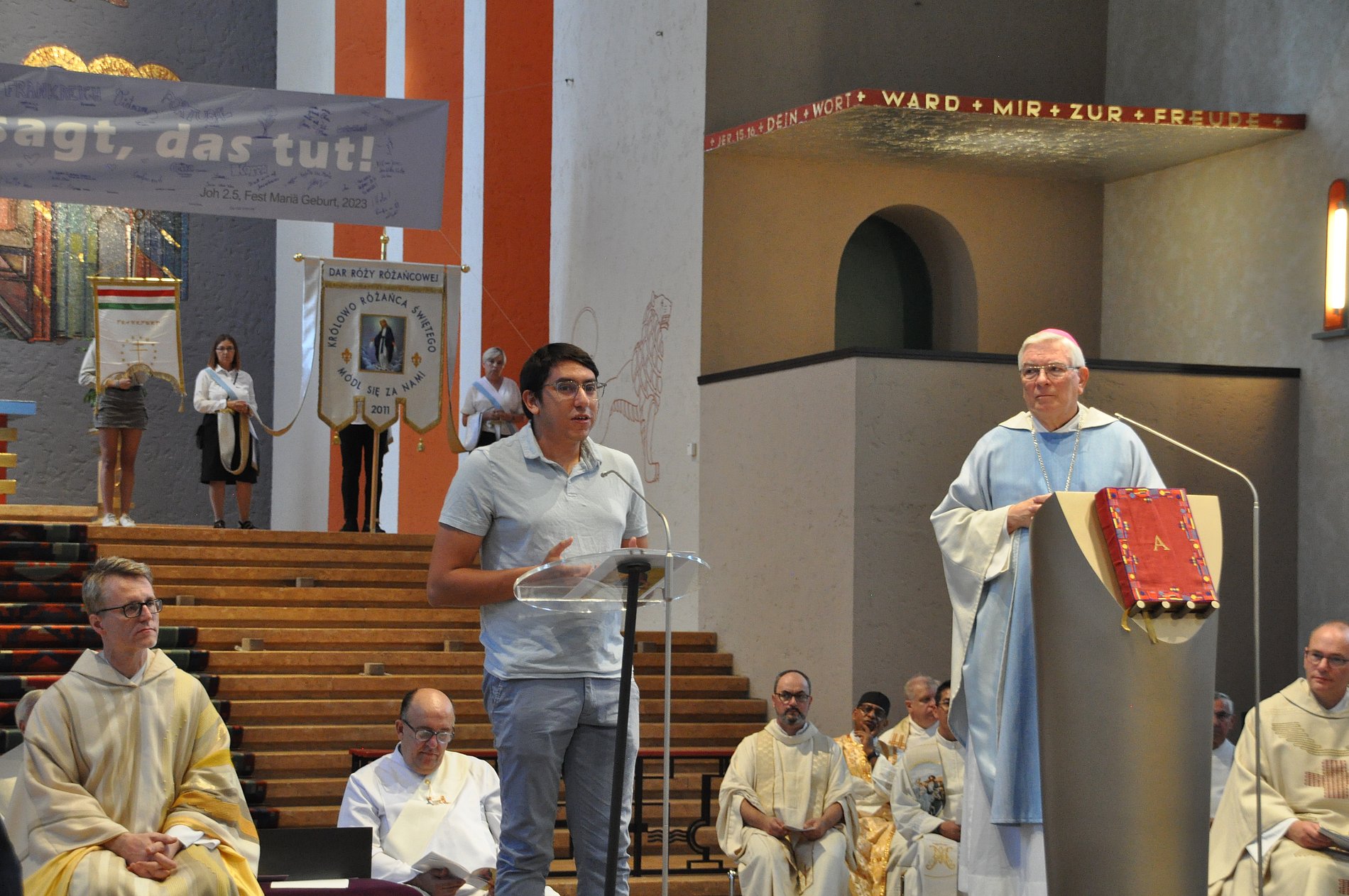 Dankbar kommen wir hierher in die Kirche Frauenfrieden. Während der Renovierung wurden wir ebenso gastlich in der Kirche Mutter vom guten Rat in Niederrad aufgenommen. Der Frieden ist das Anliegen, das wir Unserer Lieben Frau, der Jungfrau Maria, in besonderer Weise anvertrauen. Wir denken an die Menschen im Krieg, vor allem in der Ukraine, und in so vielen Ländern und Konflikten und Diktaturen und Systemen von Hass und Unterdrückung weltweit, auch in den Heimatländern Vieler von uns.