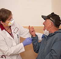 Bistum Limburg Hilfe im Pandemie-Winter Cathia Hecker Dr. Maria Goetzens bei der Behandlung in der Elisabeth-Straßenambulanz. FRANKFURT, 06.02.2021 Hilfe im Pandemie-Winter Wohnungslose trifft der Cor