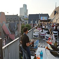 Bistum Limburg Sommerabend auf der Dachterrasse Bericht A. Zegelman / Bistum Limburg Sommerfreude auf der Dachterrasse über der Frankfurter Altstadt beim Open-Air-Kino. FRANKFURT, 31.07.2024 Sommerabe