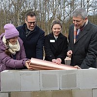 Bistum Limburg Grundstein fürs Hospiz Bericht Raphaela Hampl/Haus Elisabeth, mit KI erweitert Von links: Jördis Tielsch, Marcus Niehaves, Katharina Launhardt, Peter Bittermann beim Einlassen der Zeitk