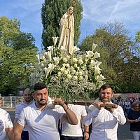 Bistum Limburg "Wir sind auf dem Weg" Bericht Paola Colombo-Beck Die Marienstatue wiegt einiges, doch für die Träger ist es eine große Ehre, mitzuhelfen. FRANKFURT, 16.09.2024 "Wir sind auf dem Weg" M