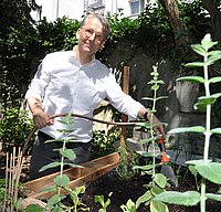 Bistum Limburg Von karg zu köstlich A. Zegelman / Bistum Limburg Christoph Soyer mit Gartenschlauch: Momentan besteht die Hauptarbeit darin, die vielen Pflanzen regelmäßig zu gießen. FRANKFURT, 07.07.