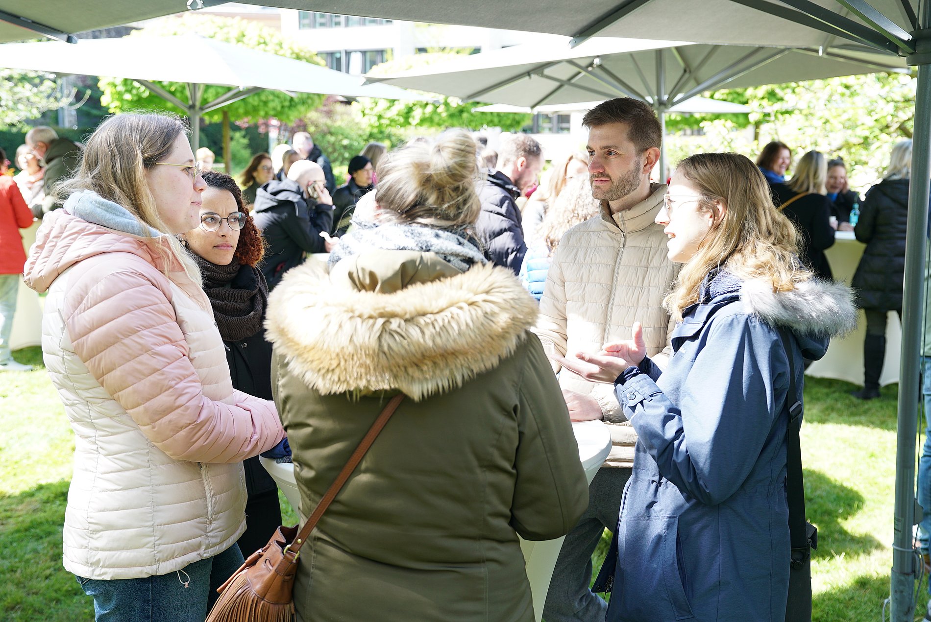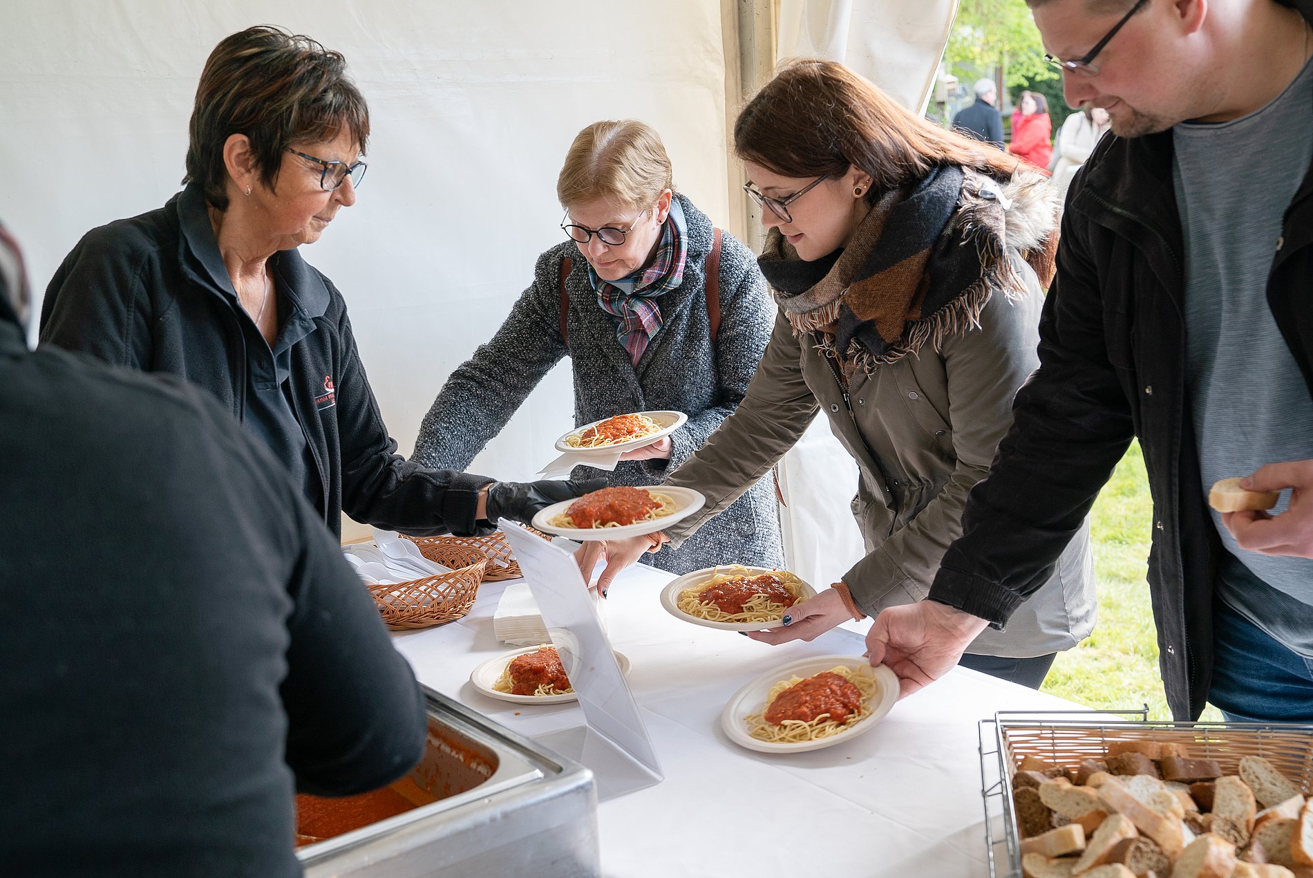 Nach einem kurzen Mittagsgebet nutzten die Mitarbeiterinnen und Mitarbeiter beim gemeinsamen Mittagsimbiss im Bischofsgarten die Möglichkeit, miteinander ins Gespräch zu kommen.