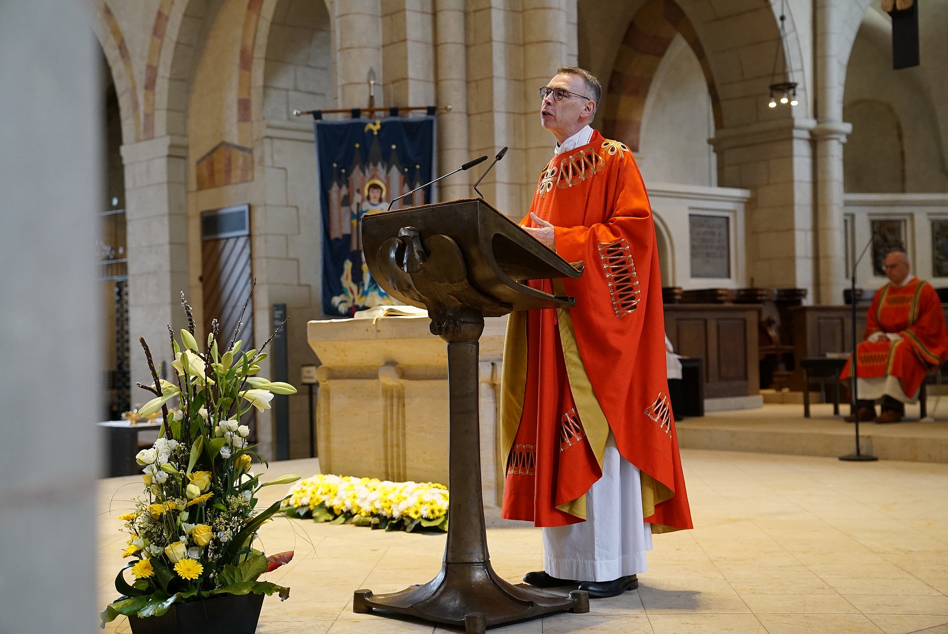 Generalvikar Dr. Wolfgang Pax übertrug in seiner Predigt die Geschichte des Heiligen Georgs in die heutige Zeit. Der Heilige markiere einen Aufbruch. Als der Drache die Menschen bedrohte, versuchten die Menschen, das Ungeheuer zu besänftigen und arrangierten sich mit dem Schlechten. Der Heilige durchbohrte das Monster und stehe damit für die notwendige Unterbrechung. Auch heute sei es notwendig zu unterbrechen, was nicht mehr weitergeführt werden könne. Kraft dafür gebe die Gemeinschaft derer, die auf die Stimme hören, sie kennen und ihr folgen.