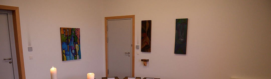 Dies ist die ökumenische Kapelle der SV-Abteilung. Seit dem Frühjahr 2014 ist der Raum eröffnet, im Februar 2015 wurde das Fenster des Künstlers Thomas Kruck aus Hadamar angebracht. Andere Teile wurden von Untergebrachten angefertigt: Die Möbel in der Schreinerei, die Bilder im Kunstraum. Der Raum ist jetzt komplett. Altaruntersatz, Füße der Hocker, Kerzenständer und Kreuzsockel in der Kapelle sind aus hellem Holz, eben nicht dunkel. Ein Zeichen, dass es möglich ist, sein Leben auf eine neue Ebene zu heben - das Dunkle, das sich nicht auslöschen lässt, so ins Leben zu integrieren, dass Leben gelingen kann.