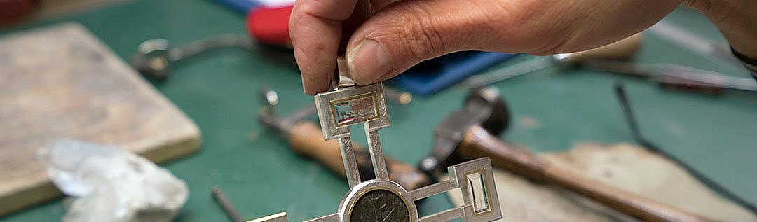 LIMBURG/VALLENDAR.- Mit präzisen, vorsichtigen Schlägen hämmert Goldschmiedin Gepa Lorenz die Münze für das Brustkreuz in ihre Fassung. Eine dunkle, robuste Kupfermünze mit dem Christusmonogramm, den griechischen Buchstaben Chi-Rho, Silber, ein Hauch von Gold sowie Bergkristall sind die Bestandteile des Bischofskreuzes. In der Goldschmiede der Schönstätter Marienbrüder in Vallendar ist das Brustkreuz für den künftigen Limburger Bischof, Dr. Georg Bätzing, entstanden. Insgesamt 92,5 Gramm wiegt es.