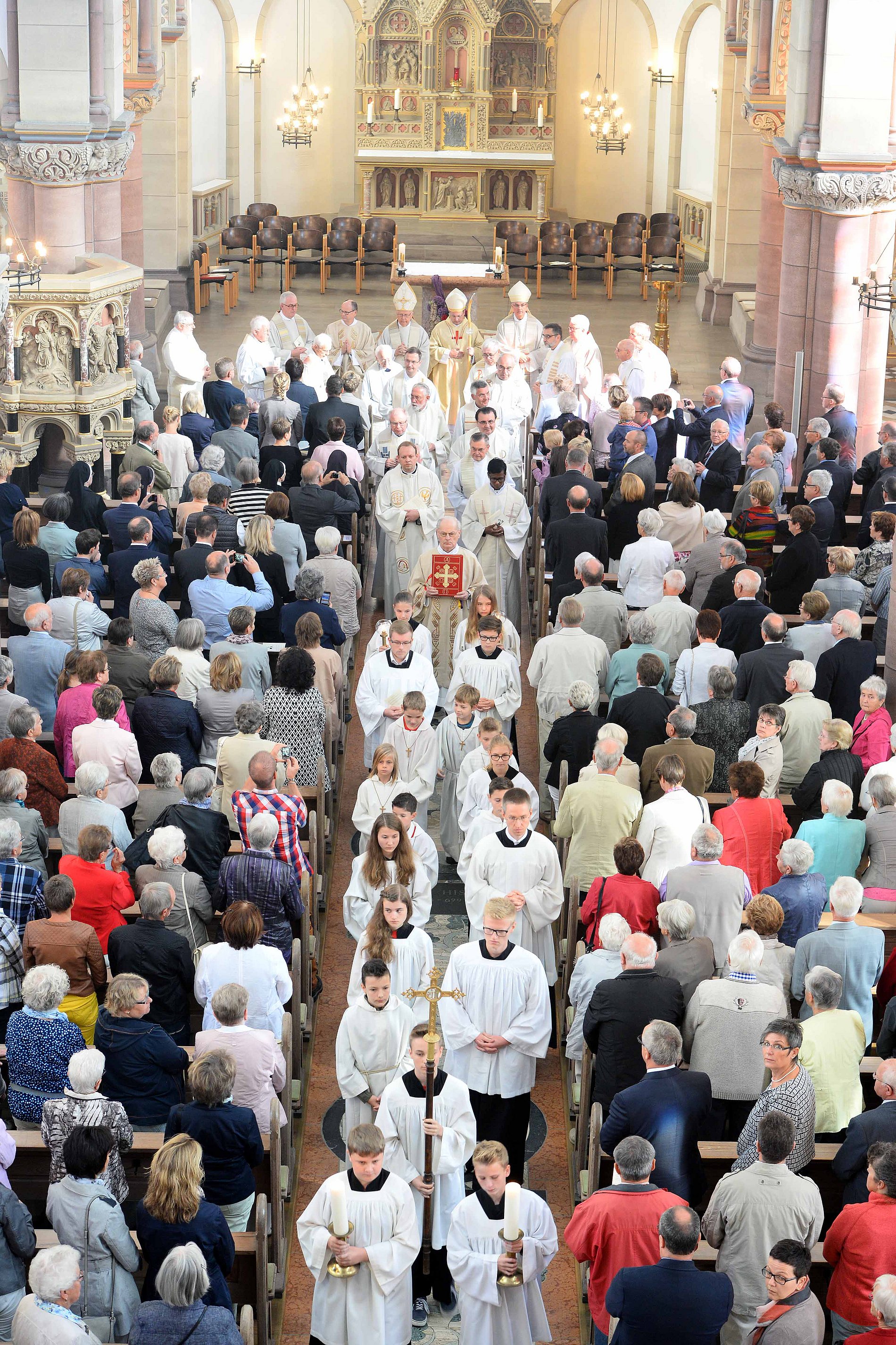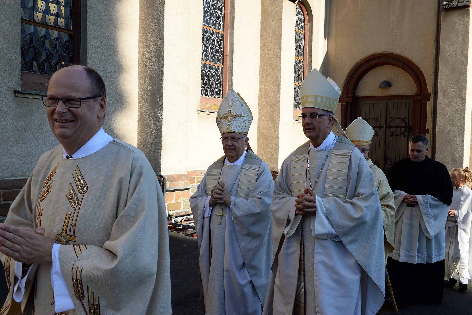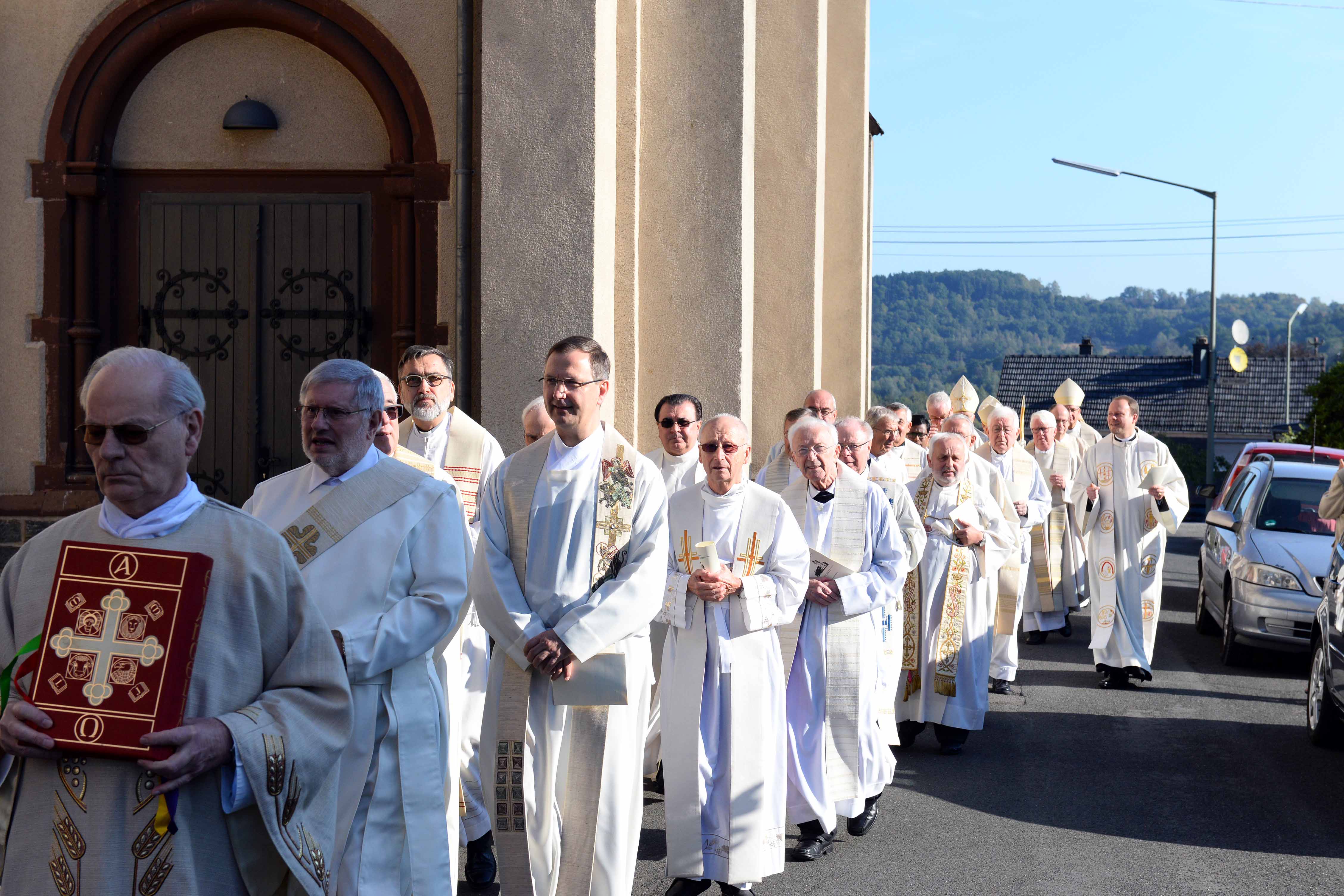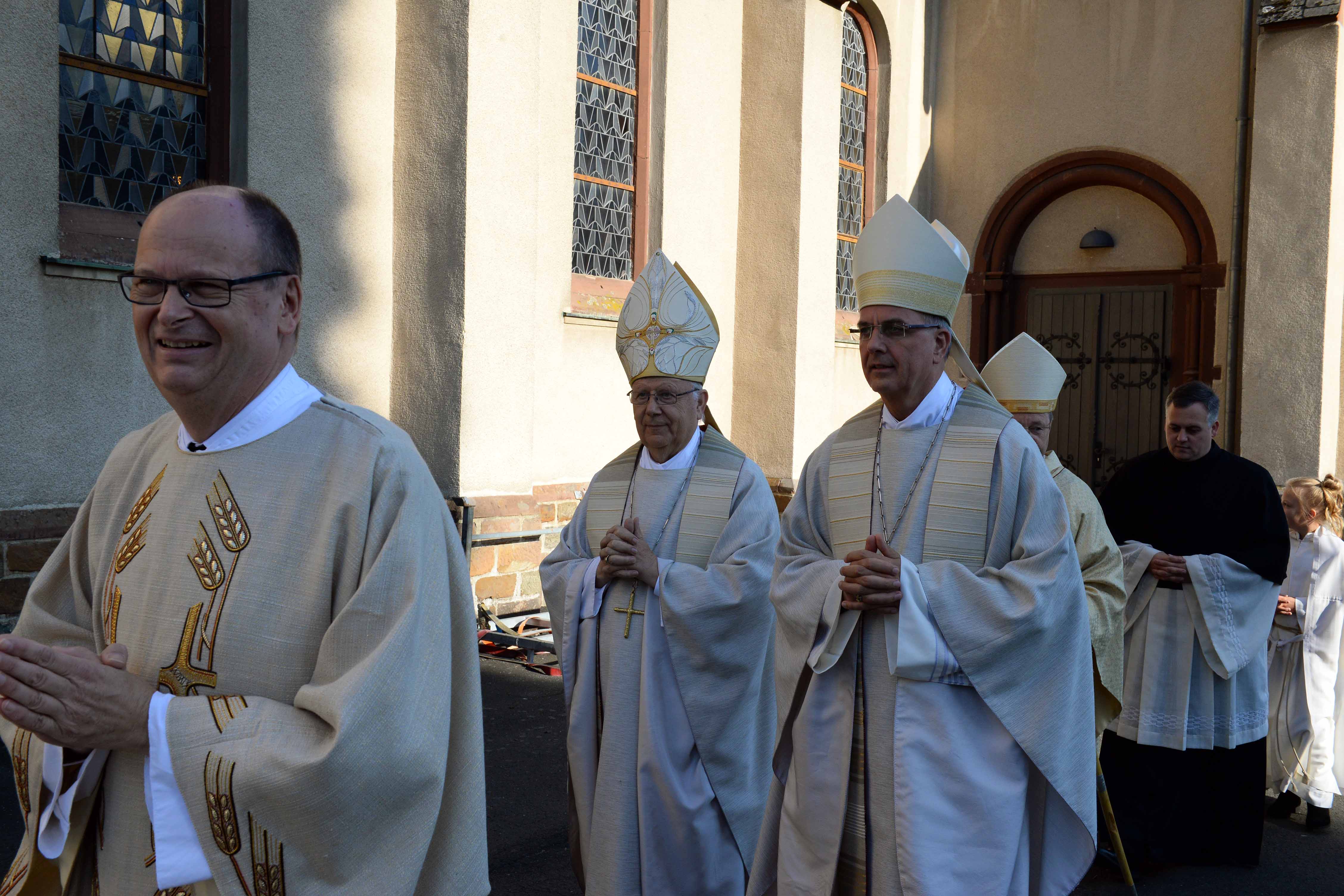"Bischofsdorf": Diesen Zusatz auf dem Ortsschild haben die Niederfischbacher ihrem Ort im Kreis Altenkirchen kurzerhand für dieses Wochenende gegeben. Sie drücken damit ihre Freude aus und sind stolz darauf, dass der neue Bischof von Limburg aus ihrem Ort und aus ihrer Pfarrgemeinde kommt. Eine Woche nach seiner Bischofsweihe und Amtseinführung hat Bischof Georg am Sonntag, 25. September, in seiner Heimat sein erstes Pontifikalamt gefeiert. Hier liegen die Wurzeln des Bischofs, und hier seien sein Glaube und seine Berufung gewachsen. Die ersten Worte des festlichen Gottesdienstes sprach er daher auf Platt und grüßte die Gäste, die aus Trier und Limburg in die Pfarrkirche St. Mauritius gekommen waren. Unter ihnen war auch Weihbischof Manfred Grothe, der als Apostolischer Administrator in den vergangenen zweieinhalb Jahren den Weg für einen Neubeginn in der Diözese bereitet hat.