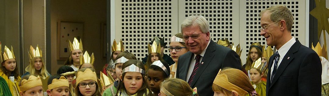 WIESBADEN/LIMBURG Am Mittwoch, 13. Januar 2016, machten sich Sternsinger aus der Pfarrei St. Jakobus Frankfurt auf den Weg zur Hessischen Staatskanzlei nach Wiesbaden, um dem Ministerpräsidenten den Segen "Christus mansionem benedicat - Christus segne dieses Haus" zu bringen. Organisiert hatte den Besuch der Bund der Deutschen Katholischen Jugend (BDKJ) in Hessen.