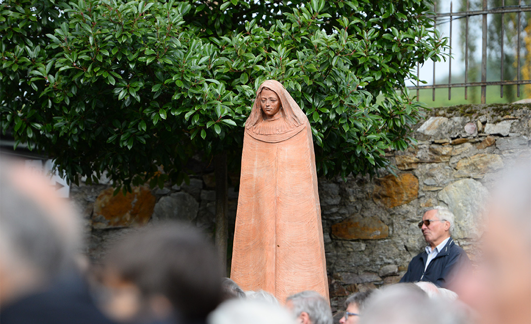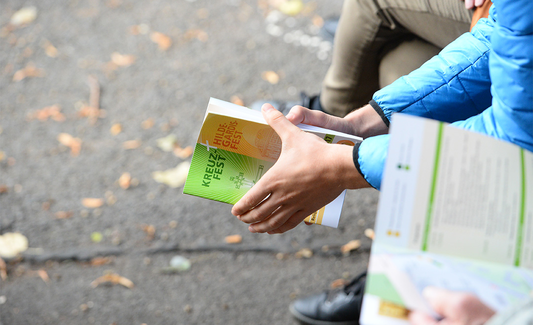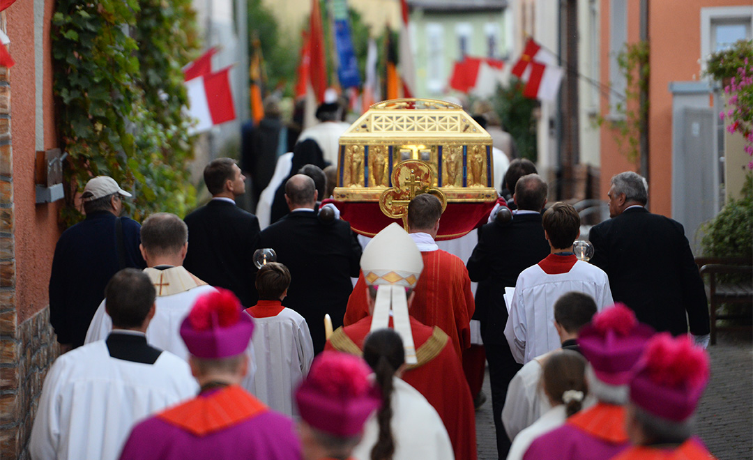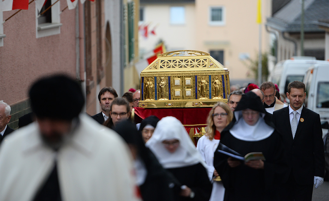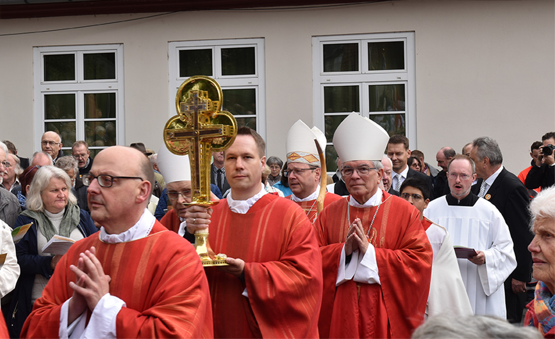 Ein Höhepunkt des Tages war die traditionelle Prozession, bei der in diesem Jahr die Kreuzreliquie und der goldene Reliquienschrein aus der Wallfahrtskirche durch die Straßen von Eibingen getragen wurden. In der vorangehenden Reliquien- und Kreuzfeier sagte Äbtissin Dorothea Flandera OSB, dass zu Gnade und Licht immer auch Abgrund und Dunkel des Kreuzes gehörten - so auch zum Leben der heiligen Hildegard von Bingen. Sie habe Not, Schwäche und Krankheit erlebt und sich dann unter Gottes Willen gestellt. "Wirklich zu leben, was wir sind und was wir erfahren haben durch Gottes Liebe", gehe oft durch das Kreuz, so die Äbtissin, weil es fordere, sich erschüttern zu lassen und sich hinzugeben. "Die Wahrheit braucht oft Überwindung und Mut, weil sie unbequem sein kann und Änderung, Umkehr erfordert."