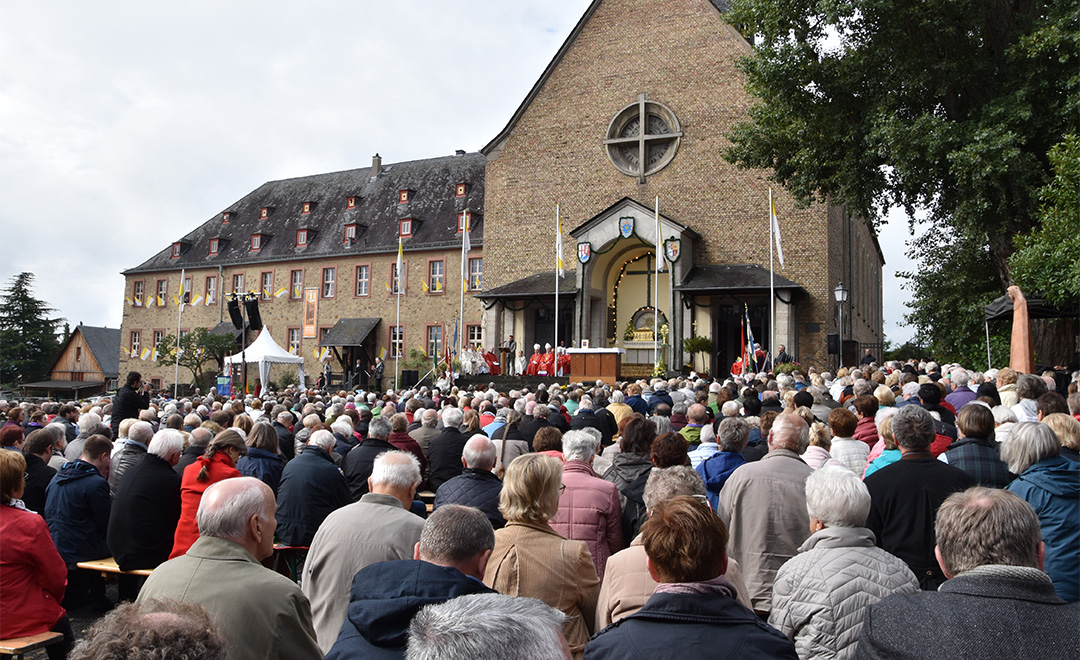 RÜDESHEIM/EIBINGEN. - Mit dem Kreuz ist heute noch ganz viel "Staat zu machen": Diese Überzeugung hat Bischof Georg Bätzing am Sonntag, 17. September, auf dem Kreuzfest des Bistums Limburg vertreten. Es gehöre nach wie vor in das öffentliche Blickfeld, sagte er im Pontifikalamt auf dem Platz vor der Wallfahrtskirche St. Hildegard, auch wenn mittlerweile so getan werde, als sei es eine Art Firmenlogo der Kirche: "Das sollten wir uns nicht einreden lassen", forderte er nachdrücklich die rund 1600 Gläubigen auf, die zur gemeinsamen Feier von Kreuzfest und Hildegardisfest nach Eibingen gekommen waren. "Das Kreuz steht für Gott und es steht für den Menschen in seiner Würde von Anfang bis Endes seines Lebens."