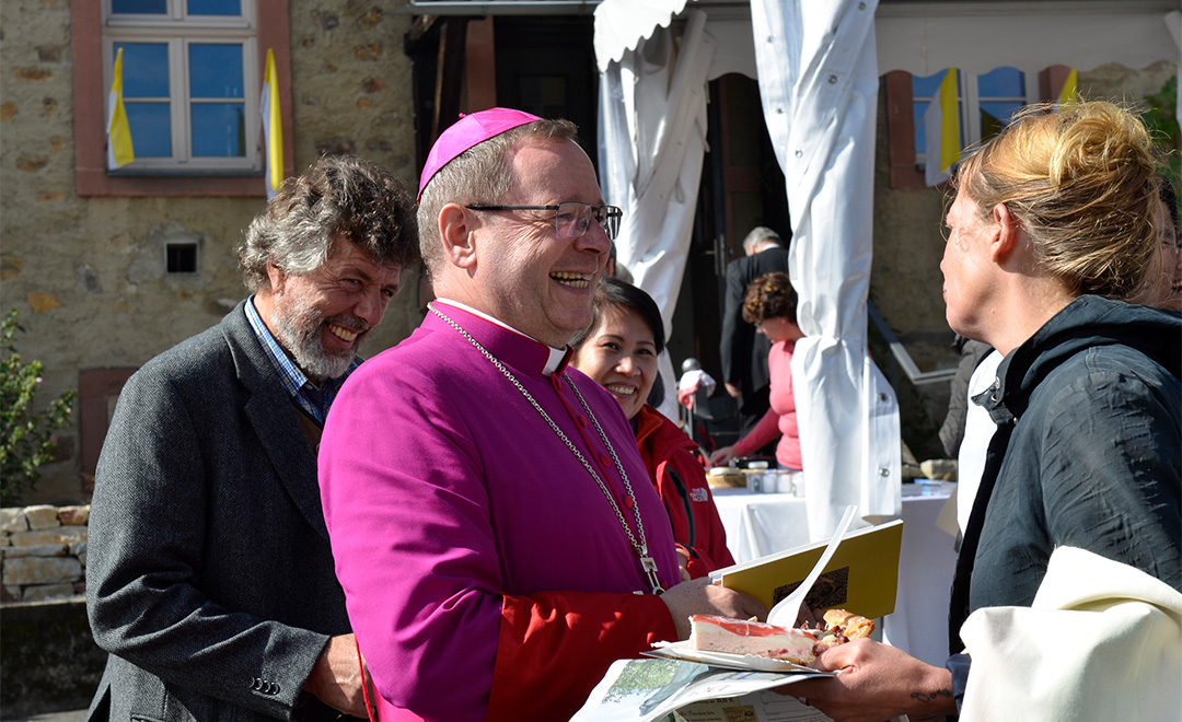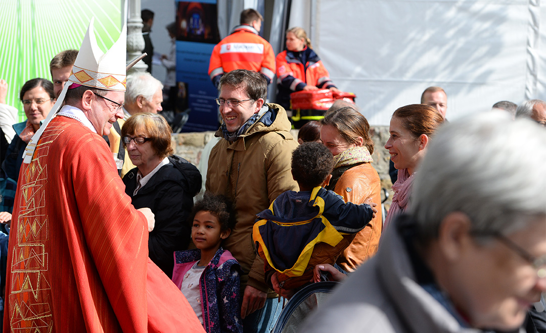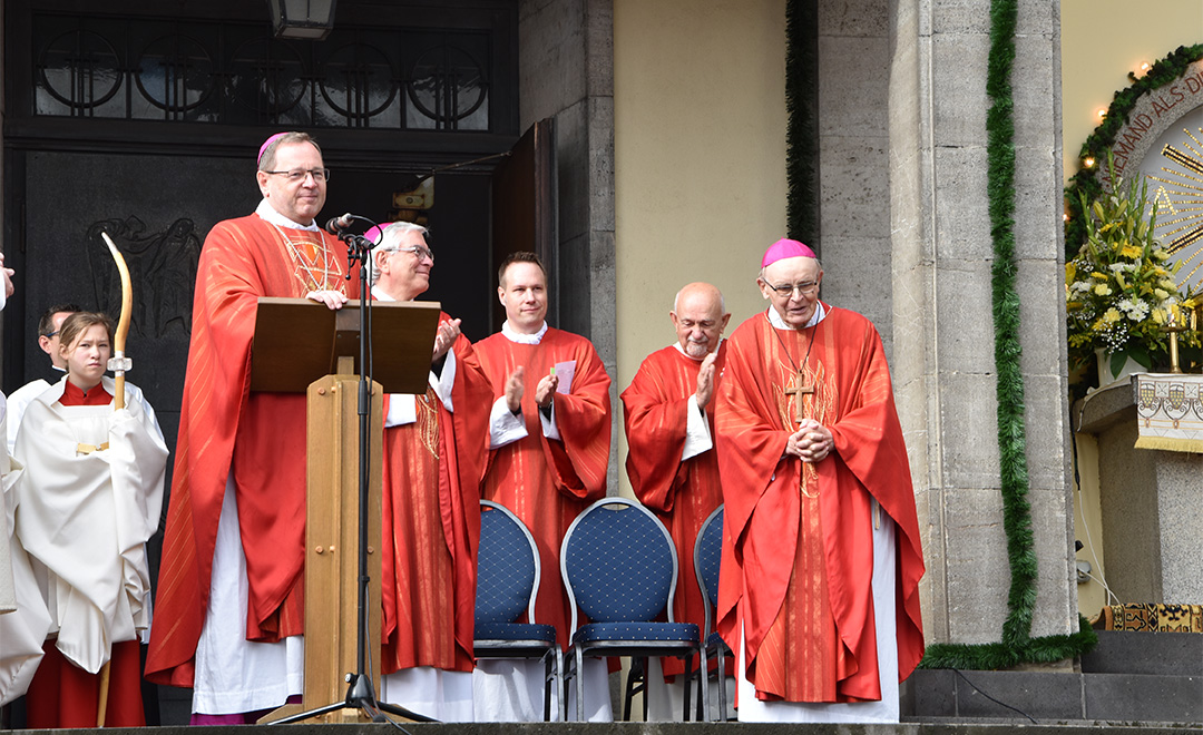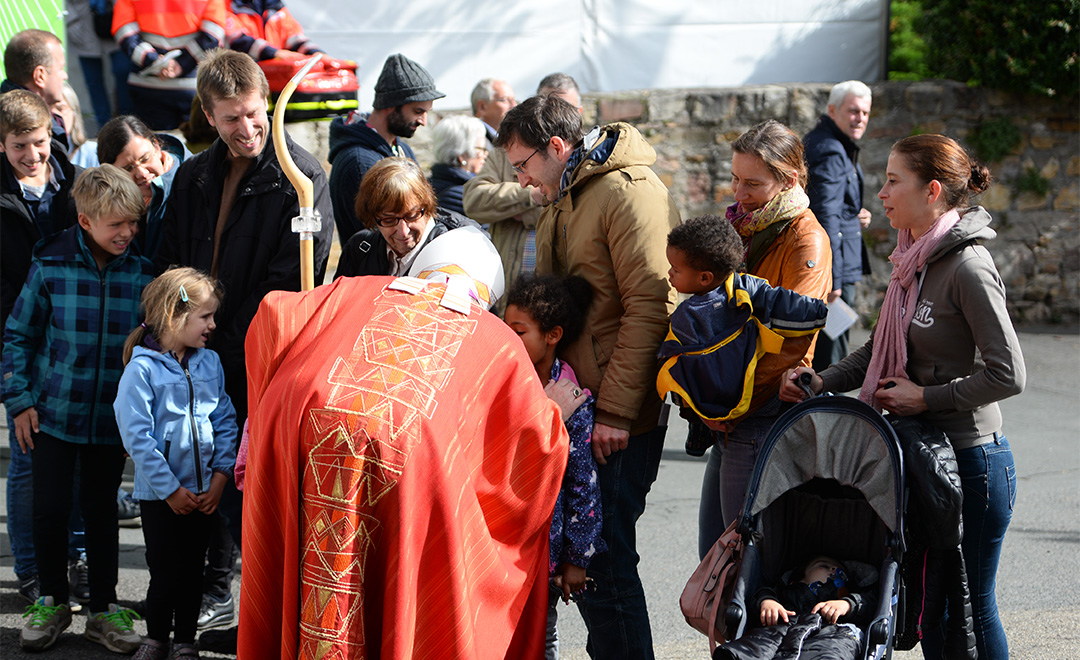 Die gemeinsame Feier der beiden Feste war eine Premiere, auch für den Hauptzelebranten, der fast auf den Tag genau vor einem Jahr in Limburg geweiht worden ist. Daran erinnerte Bezirksdekan Ralph Senft in seiner Begrüßung und versicherte dem Limburger Bischof unter Applaus: "Sie sind in unserem Bistum und unseren Herzen angekommen." Der wiederum begrüßte mit besonderer Herzlichkeit seinen Vor-Vorgänger Franz Kamphaus, der in diesem Jahr 85 Jahre alt wurde und seit 35 Jahren Bischof ist: "Das muss Dir erst mal einer nachmachen."