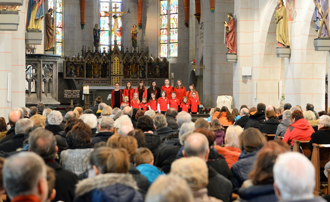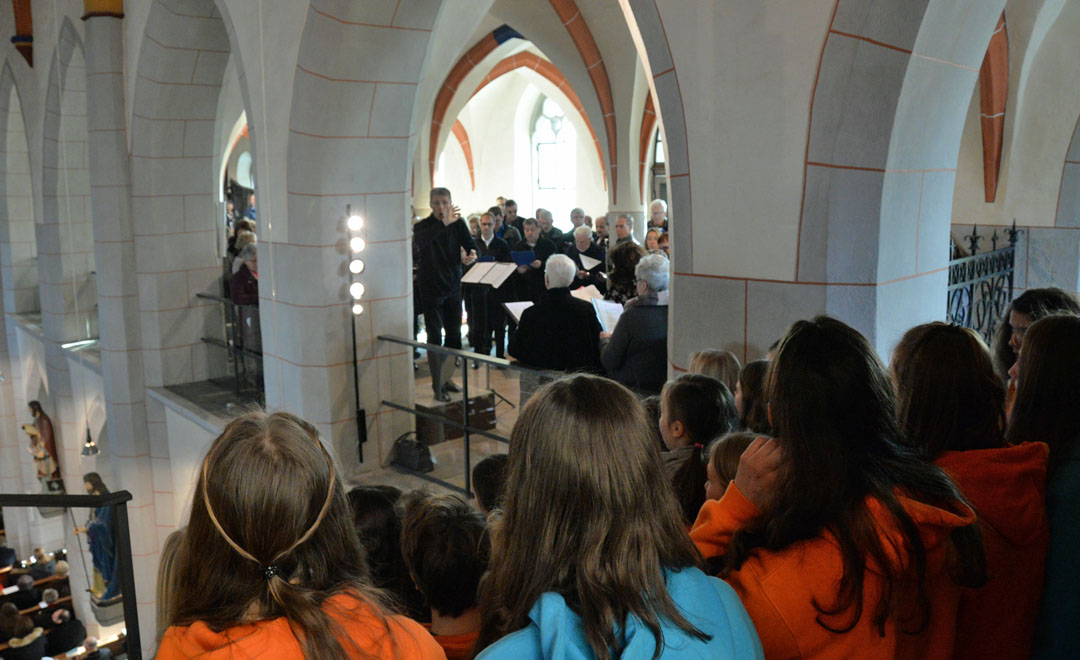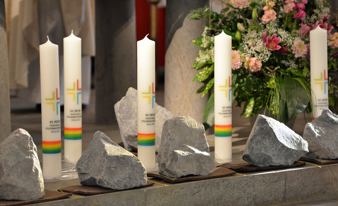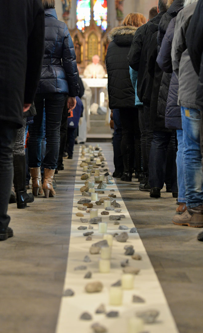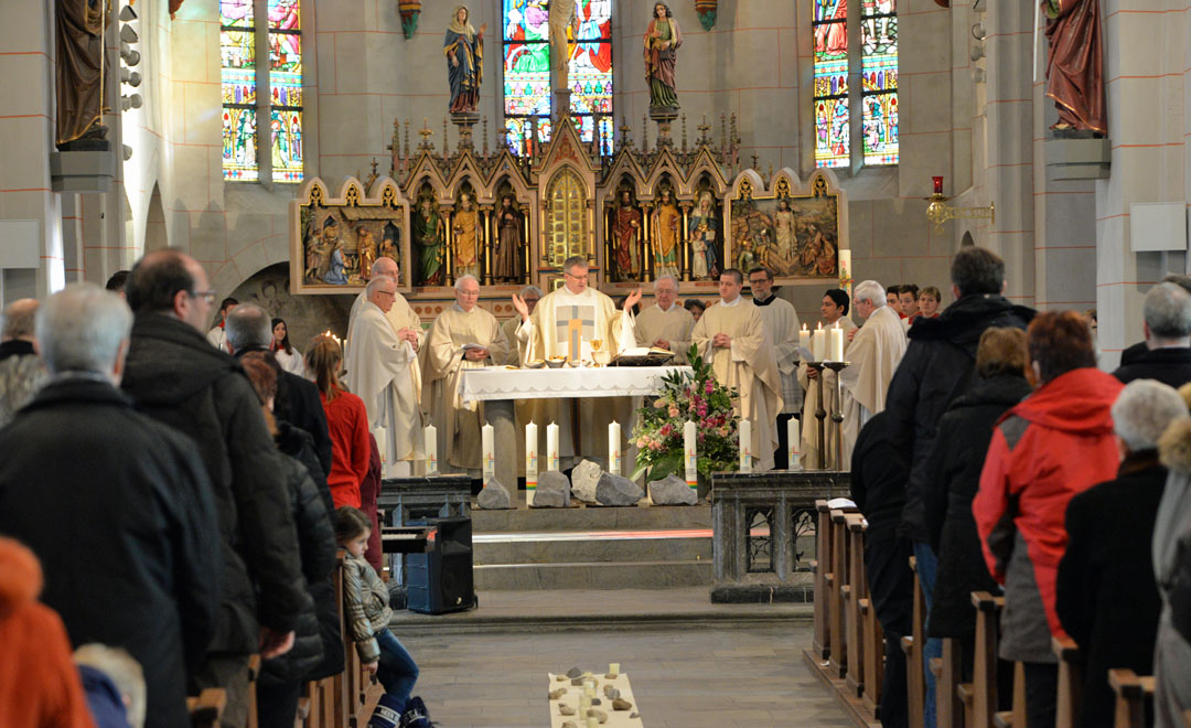 Mehr als 100 Sängerinnen und Sänger aus dem Projektchor unter der Leitung von Bezirkskantor Andreas Loheide gestalteten den besonderen Gottesdienst musikalisch mit. In der Pfarrkirche wurde außerdem ein Weg aus Steinen und Kerzen ausgelegt. Dieser stand symbolisch für die vielen Schwierigkeiten und Herausforderungen, die im Zuge der etwa eineinhalb Jahre dauernden Pfarreiwerdung gemeistert werden mussten. Vertreter der Kirchorte erhielten in Erinnerung an die Gründung der Pfarrei jeweils für ihren Kirchort eine Kerze und einen Basaltstein.