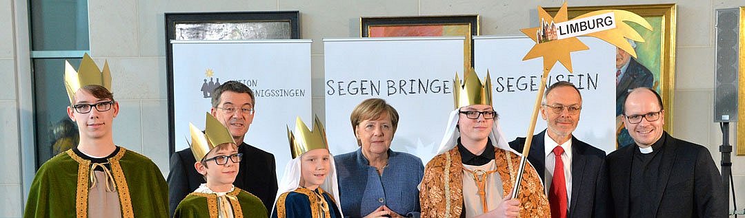 Die Spende der Bundeskanzlerin durften die Sternsinger aus dem Erzbistum Köln entgegennehmen. Angela Merkel unterstützt damit Bildungsprojekte für arbeitende Kinder im südindischen Bundesstaat Tamil Nadu, die von den Sternsingern gefördert werden. Mara (13), Mia (10), Peter (10) und Louisa (13) aus der Gemeinde St. Martinus in Neuss-Holzheim sagten anschließend auch den Sternsingersegen auf, in dem auch sie noch einmal auf das Thema Kinderarbeit und die Unterstützung der Bundeskanzlerin eingingen: "Wir wollen das Leben der Kinder verändern, die arbeiten müssen in so vielen Ländern. Allein wird es schwer, doch mit euch kann es gehen, dass Kinder im Dunkel das Sonnenlicht sehn." An prominenter Stelle im Kanzleramt schrieben die Neusser Sternsinger zum Abschluss des Empfangs den Segen 20*C+M+B+18 an.