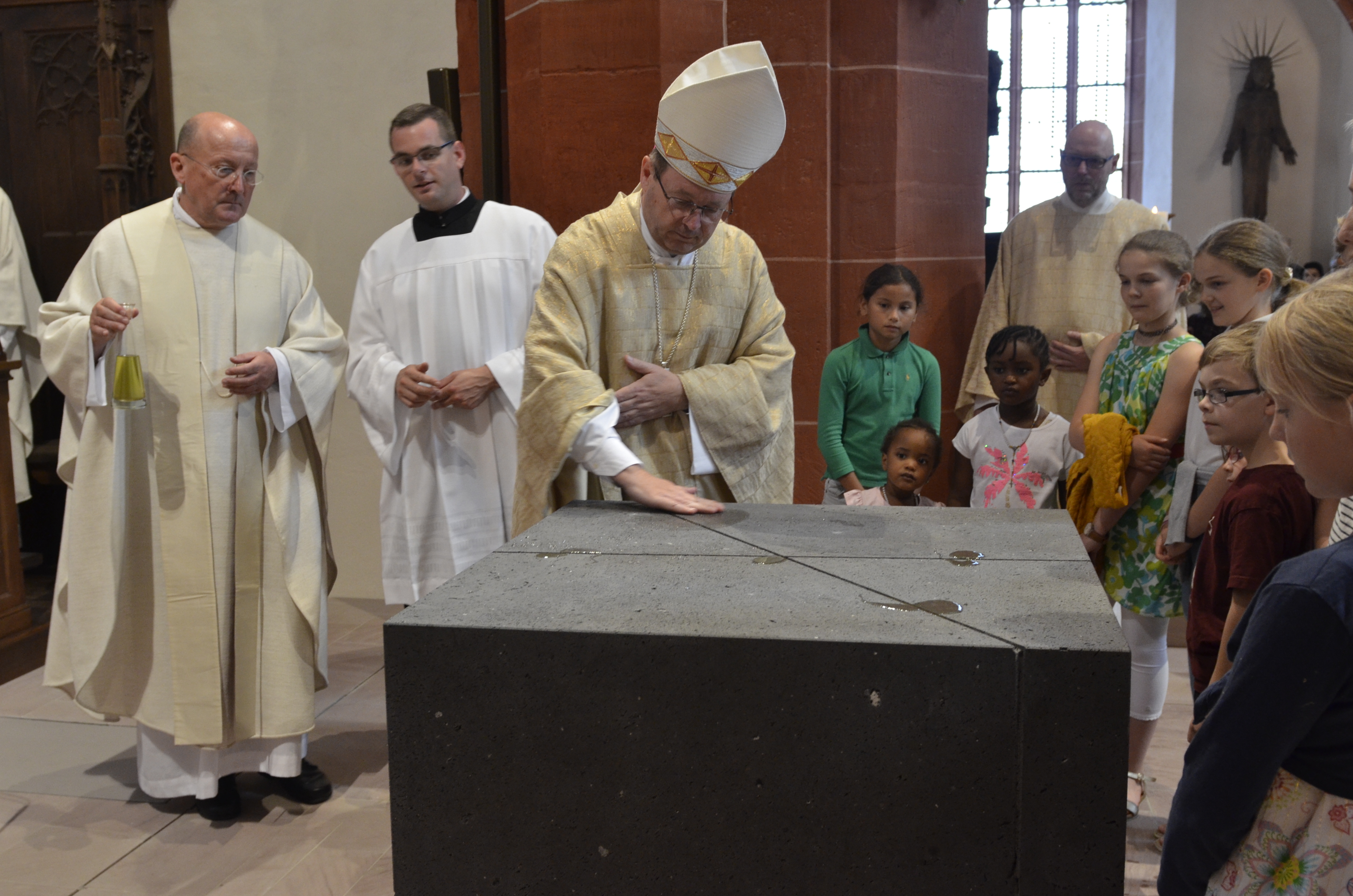 Bei der feierlichen Weihe des neuen Altars erinnerte der Bischof an mindestens zehn gründliche Einschnitte in der Bau- und Nutzungsgeschichte der Kirche am Main. Umbauten, Renovierungen, Erweiterungen, Wiedereröffnungen und Altarweihen kennt diese wohl zuhauf. Für die Gläubigen heutzutage ist es ein besonderes Ereignis, wenn der schlichte Tisch mit Weihwasser besprengt, gesalbt und Weihrauch auf ihm verbrannt wird. Erst damit gewinnt er seine eigentliche Bedeutung als „Tisch des Herrn, Sammlungspunkt des Volkes Gottes, Mitte von Dank und Bitte“ und strahlt damit weit hinaus über die kostbare Architektur, die Bedeutung der Kunstwerke und die 800-jährige Geschichte mitten in der Stadt.