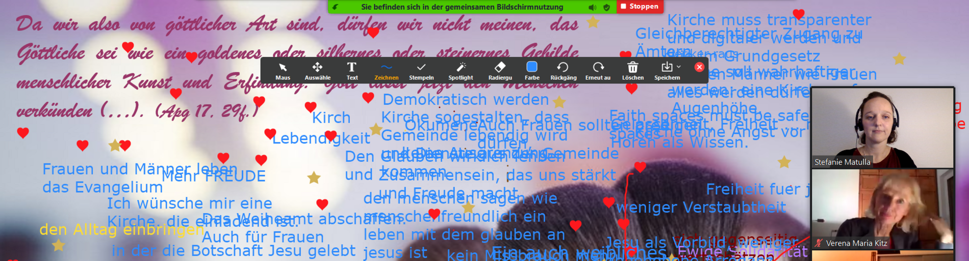 Mit diesen Eindrücken wurden die Teilnehmerinnen in virtuelle Kleingruppen geschickt, um sich auszutauschen und zu überlegen, wie sie ganz konkret in ihrem Kontext Kirche gestalten können. Dabei kamen einige Stichworte zusammen, wie beispielsweise „Dinge, die in der Bibel verkündet werden, auch leben, nicht nur die, die einem am besten passen“, „gleichberechtigter Zugang zu Ämtern“, „weg mit der toten Kirchensprache“, „lebendig werden“.