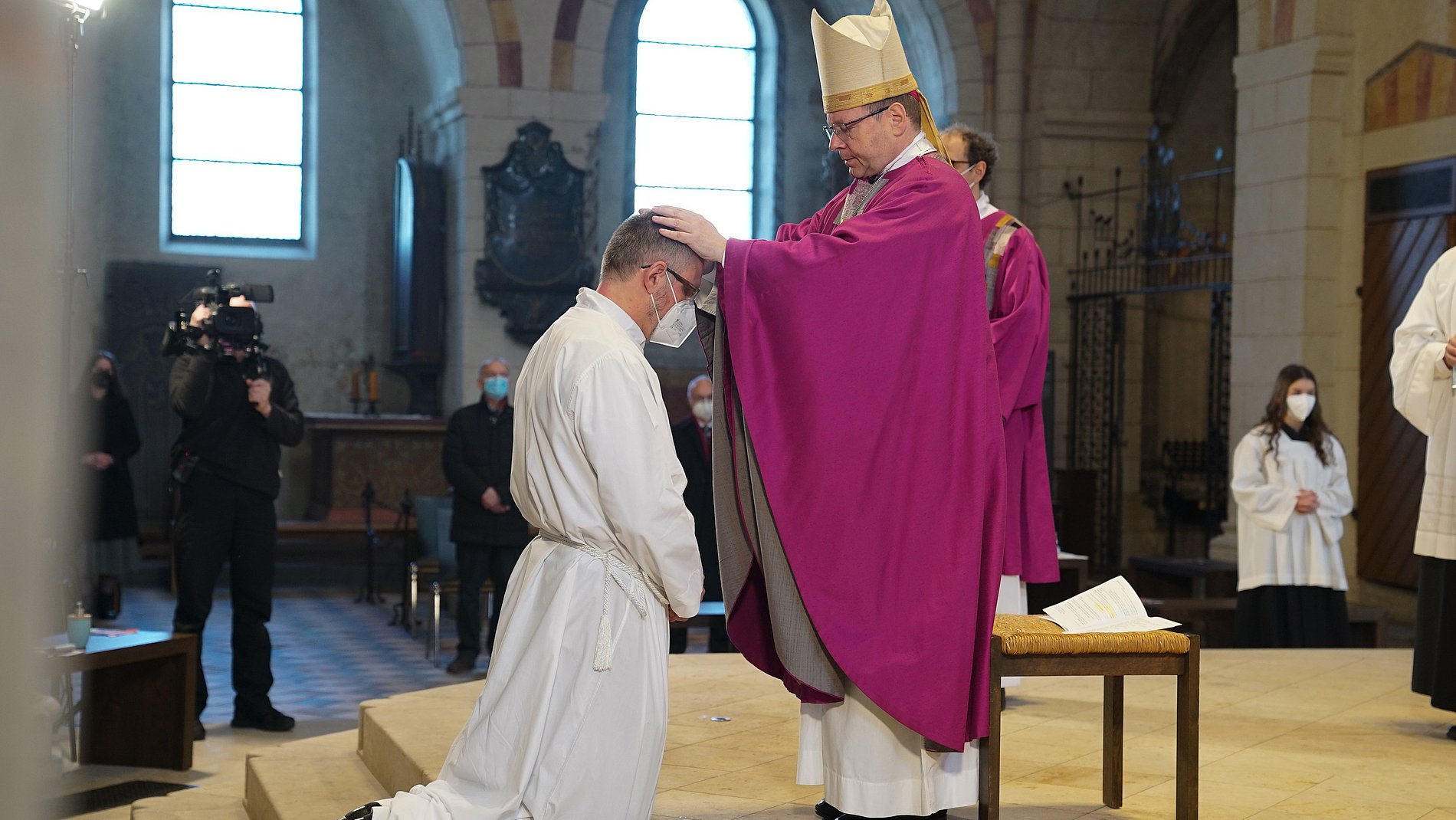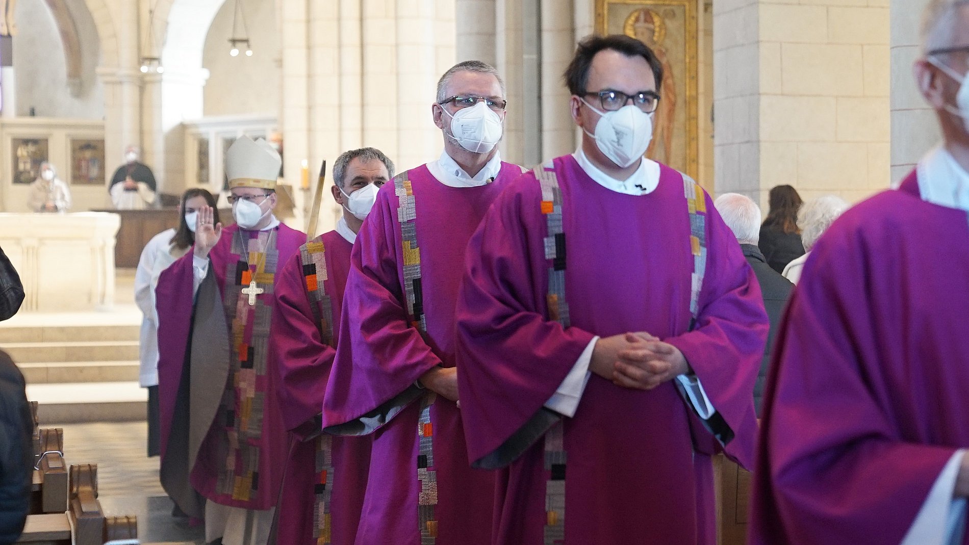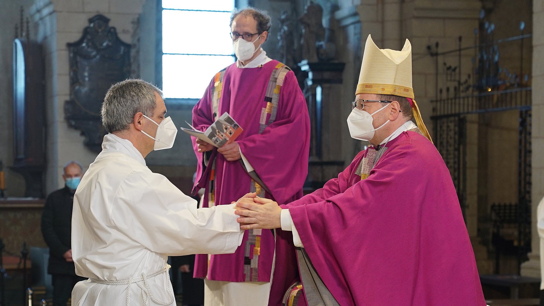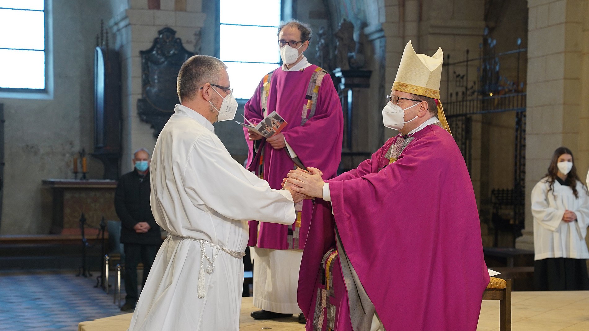 Mit Abstand und Gottes Segen: Drei Männer wurden am Samstag, 20. März, von Bischof Dr. Georg Bätzing im Hohen Dom zu Limburg zu Ständigen Diakonen geweiht. Bei den neugeweihten handelt es sich um Prof. Dr. Stephan Herzberg aus der Pfarrei St. Franziskus und Klara im Usinger Land, Felix Predikant aus St. Gallus in Flörsheim und Kristof Windolf aus der Pfarrei Heilige Familie im Untertaunus. Die verheirateten Männer üben neben ihrem Amt als Diakone weiterhin ihre weltlichen Berufe aus. Auch die Familien unterstützten die Männer bei der Weihe. Nicole Windolf, die Frau von Diakon Kristof Windolf, hat die Kommunionausteilung musikalisch auf der Violine begleitet und die Töchter der Diakone waren als Ministrantinnen dabei. Aufgrund der Auflagen zum Schutz vor dem Coronavirus war die Anzahl der Gottesdienstbesucher begrenzt. Zusätzlich konnte der Gottesdienst aber im Live-Stream mitverfolgt werden. Insgesamt feierten im Dom und im Live-Stream etwa 500 Menschen die Weihe.