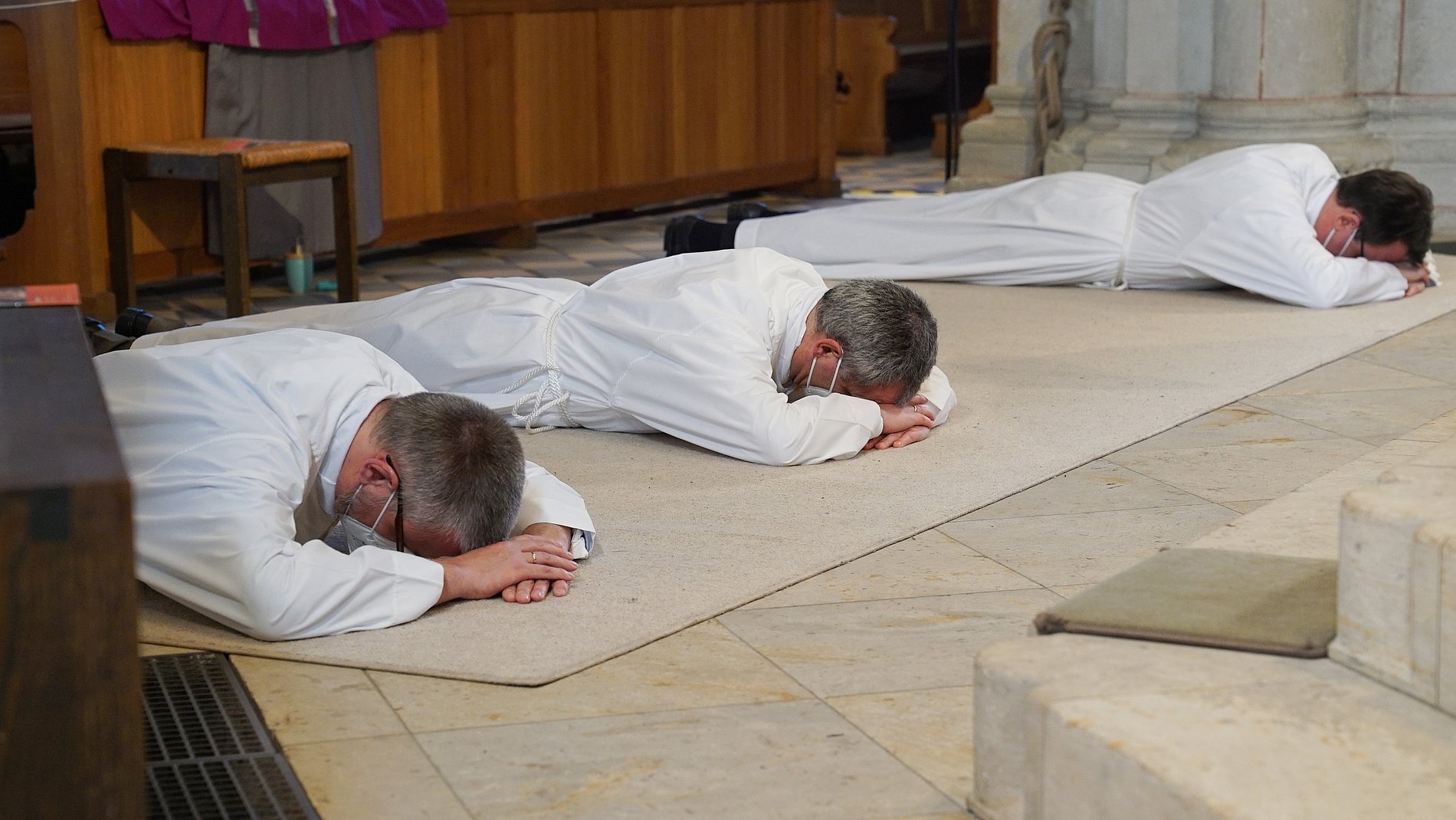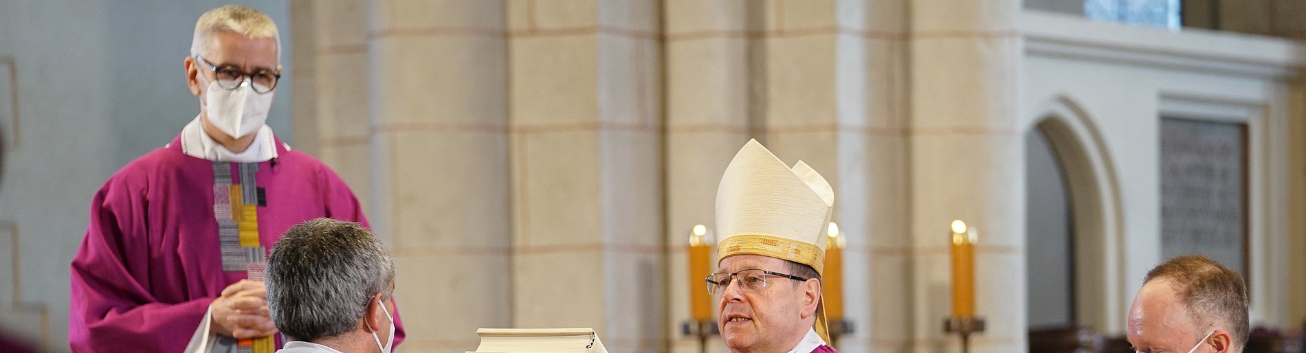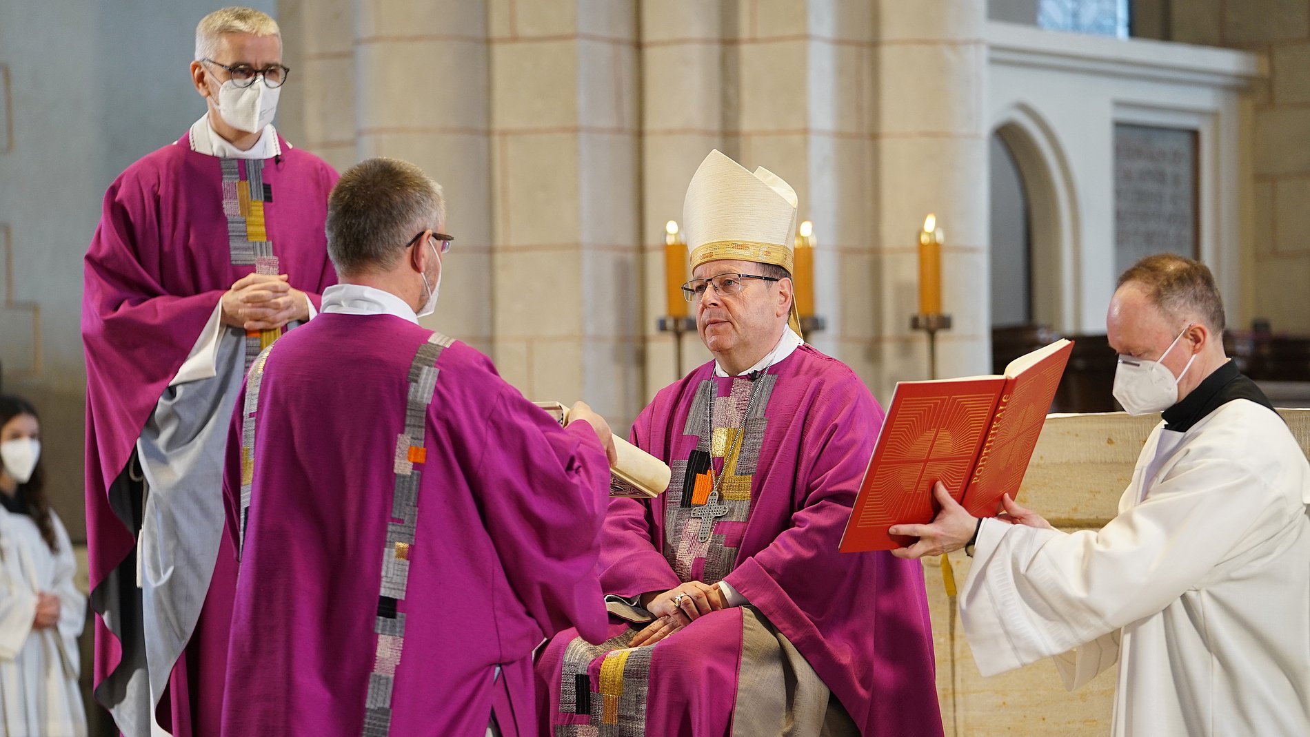 Mit Abstand und Gottes Segen: Drei Männer wurden am Samstag, 20. März, von Bischof Dr. Georg Bätzing im Hohen Dom zu Limburg zu Ständigen Diakonen geweiht. Bei den neugeweihten handelt es sich um Prof. Dr. Stephan Herzberg aus der Pfarrei St. Franziskus und Klara im Usinger Land, Felix Predikant aus St. Gallus in Flörsheim und Kristof Windolf aus der Pfarrei Heilige Familie im Untertaunus. Die verheirateten Männer üben neben ihrem Amt als Diakone weiterhin ihre weltlichen Berufe aus. Auch die Familien unterstützten die Männer bei der Weihe. Nicole Windolf, die Frau von Diakon Kristof Windolf, hat die Kommunionausteilung musikalisch auf der Violine begleitet und die Töchter der Diakone waren als Ministrantinnen dabei. Aufgrund der Auflagen zum Schutz vor dem Coronavirus war die Anzahl der Gottesdienstbesucher begrenzt. Zusätzlich konnte der Gottesdienst aber im Live-Stream mitverfolgt werden. Insgesamt feierten im Dom und im Live-Stream etwa 500 Menschen die Weihe.