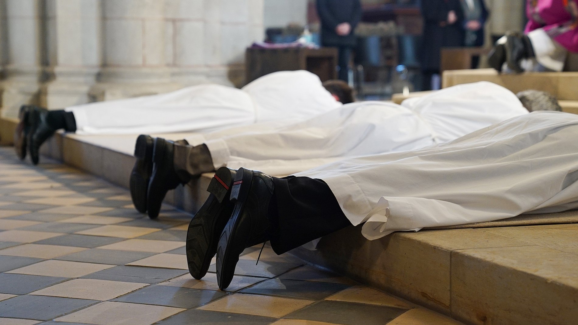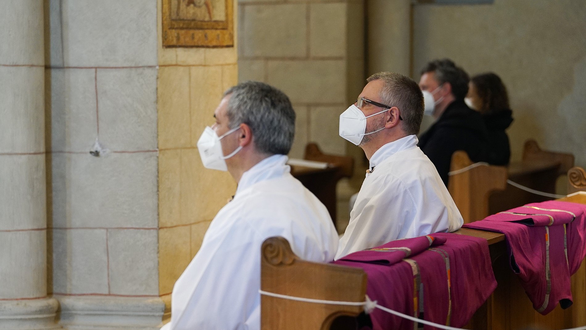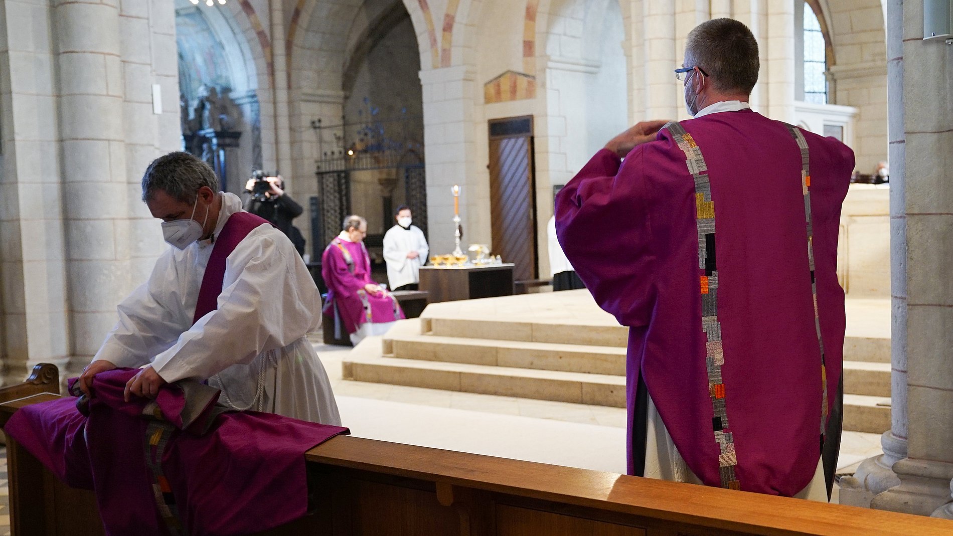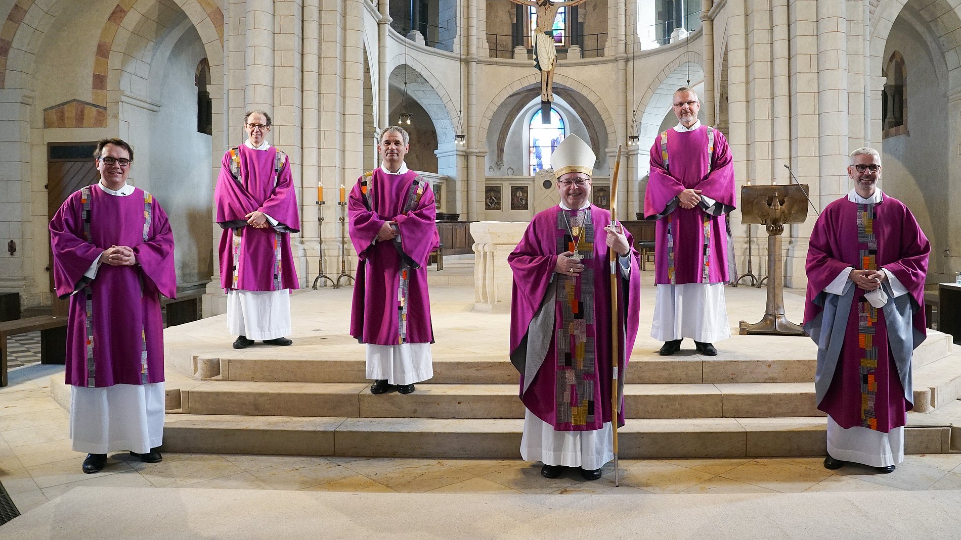 Mit Abstand und Gottes Segen: Drei Männer wurden am Samstag, 20. März, von Bischof Dr. Georg Bätzing im Hohen Dom zu Limburg zu Ständigen Diakonen geweiht. Bei den neugeweihten handelt es sich um Prof. Dr. Stephan Herzberg aus der Pfarrei St. Franziskus und Klara im Usinger Land, Felix Predikant aus St. Gallus in Flörsheim und Kristof Windolf aus der Pfarrei Heilige Familie im Untertaunus. Die verheirateten Männer üben neben ihrem Amt als Diakone weiterhin ihre weltlichen Berufe aus. Auch die Familien unterstützten die Männer bei der Weihe. Nicole Windolf, die Frau von Diakon Kristof Windolf, hat die Kommunionausteilung musikalisch auf der Violine begleitet und die Töchter der Diakone waren als Ministrantinnen dabei. Aufgrund der Auflagen zum Schutz vor dem Coronavirus war die Anzahl der Gottesdienstbesucher begrenzt. Zusätzlich konnte der Gottesdienst aber im Live-Stream mitverfolgt werden. Insgesamt feierten im Dom und im Live-Stream etwa 500 Menschen die Weihe.