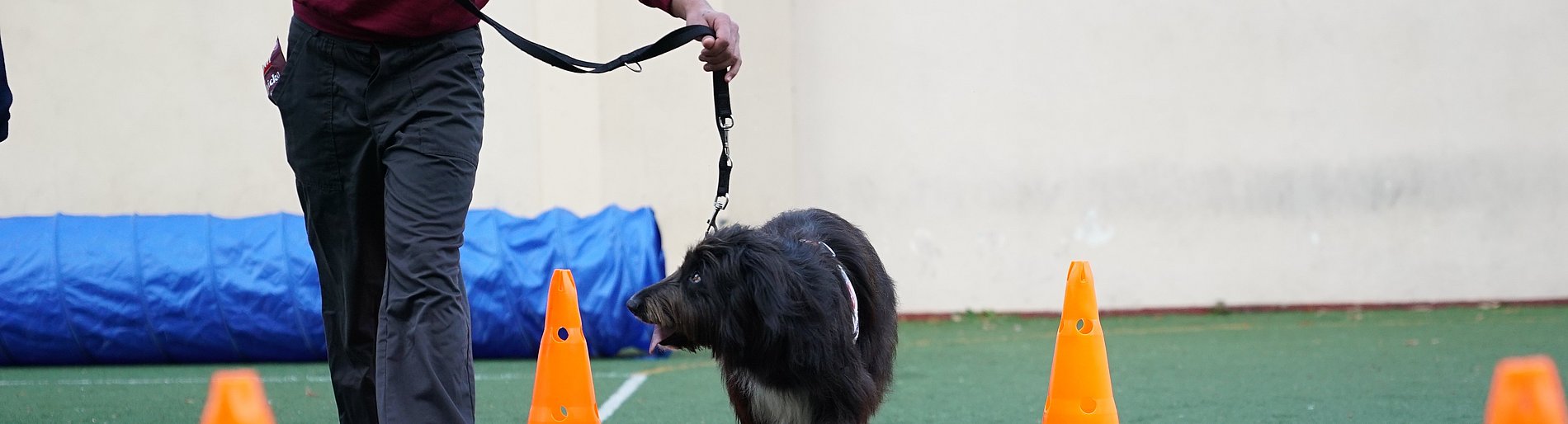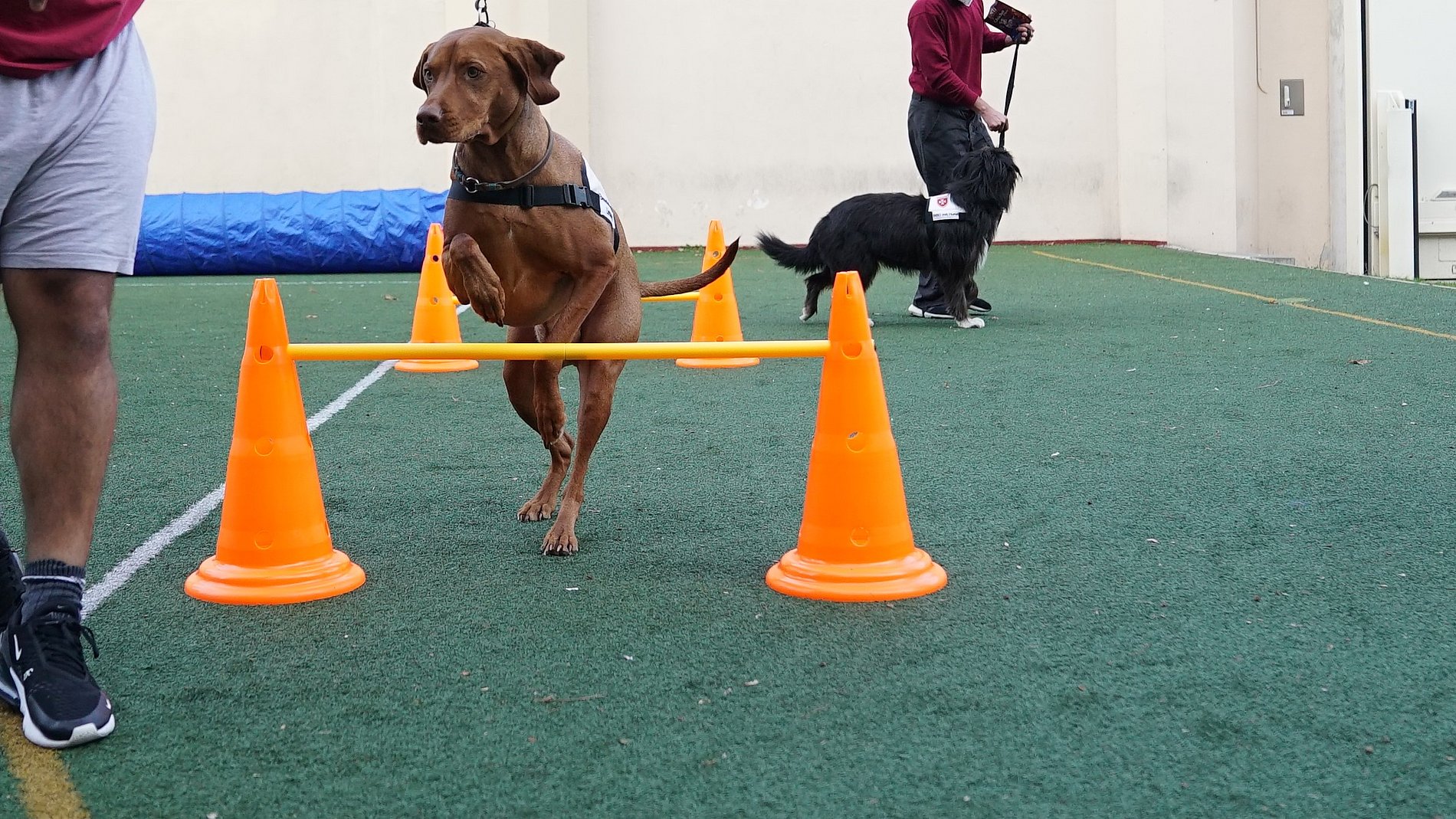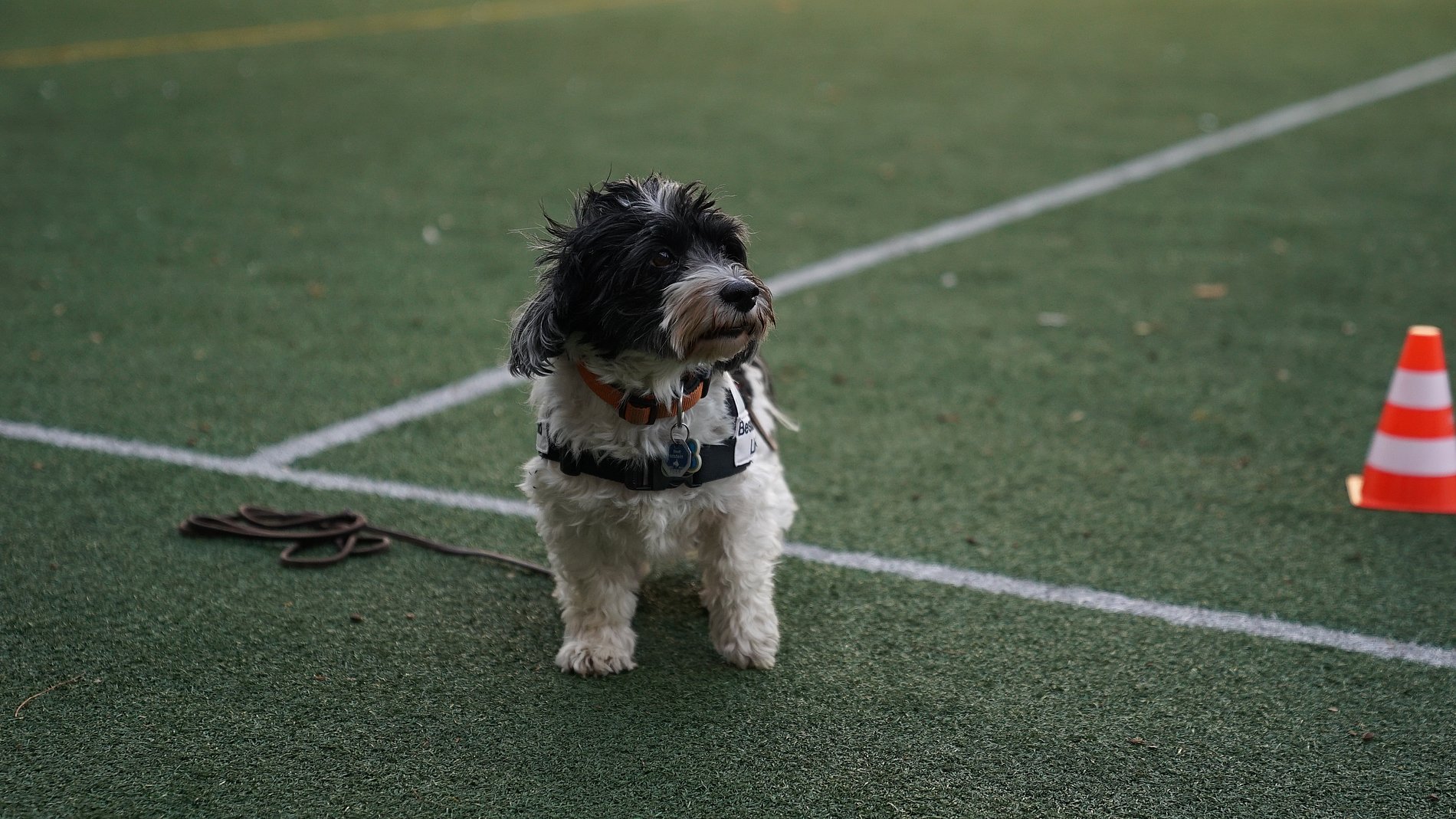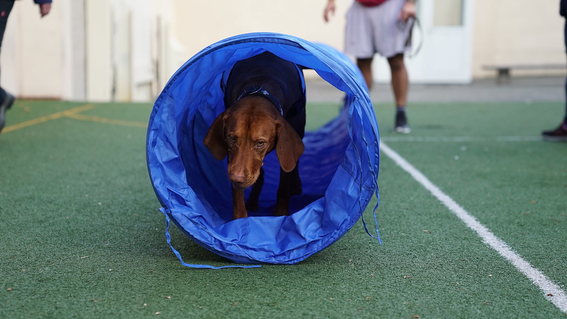 Genug Platz für das Training bietet die Kunstrasenfläche auf dem Innenhof der JVA. Wenn die Hunde kommen, sind dort immer viele Hindernisse aufgebaut: orangefarbene Hütchen, Hürden in verschiedenen Höhen oder auch ein blaues Tunnelzelt. Die Hindernisse stehen im Kontrast zu den tristen, meterhohen Mauern mit Stacheldraht, die den Kunstrasen von drei Seiten umgeben. Die vierte Seite bildet das Gebäude selbst. Hinter den zahllosen Fenstern mit Gittern blitzt ab und an ein Gesicht hindurch. Kein Wunder, denn auf dem Kunstrasen ist gerade einiges los. Bailey ist nämlich nicht der einzige Hund an diesem Freitag. Mit ihm sind auch noch vier weitere Hunde gekommen: Dackelhündin Fine, Viszla Paul, Mischlingshündin Nelli und Havaneser Rocky. Ein Justizvollzugsbeamter ist während des gesamten Besuchs dabei und garantiert für die Sicherheit.