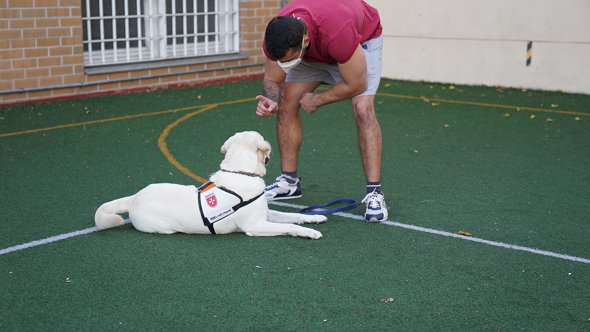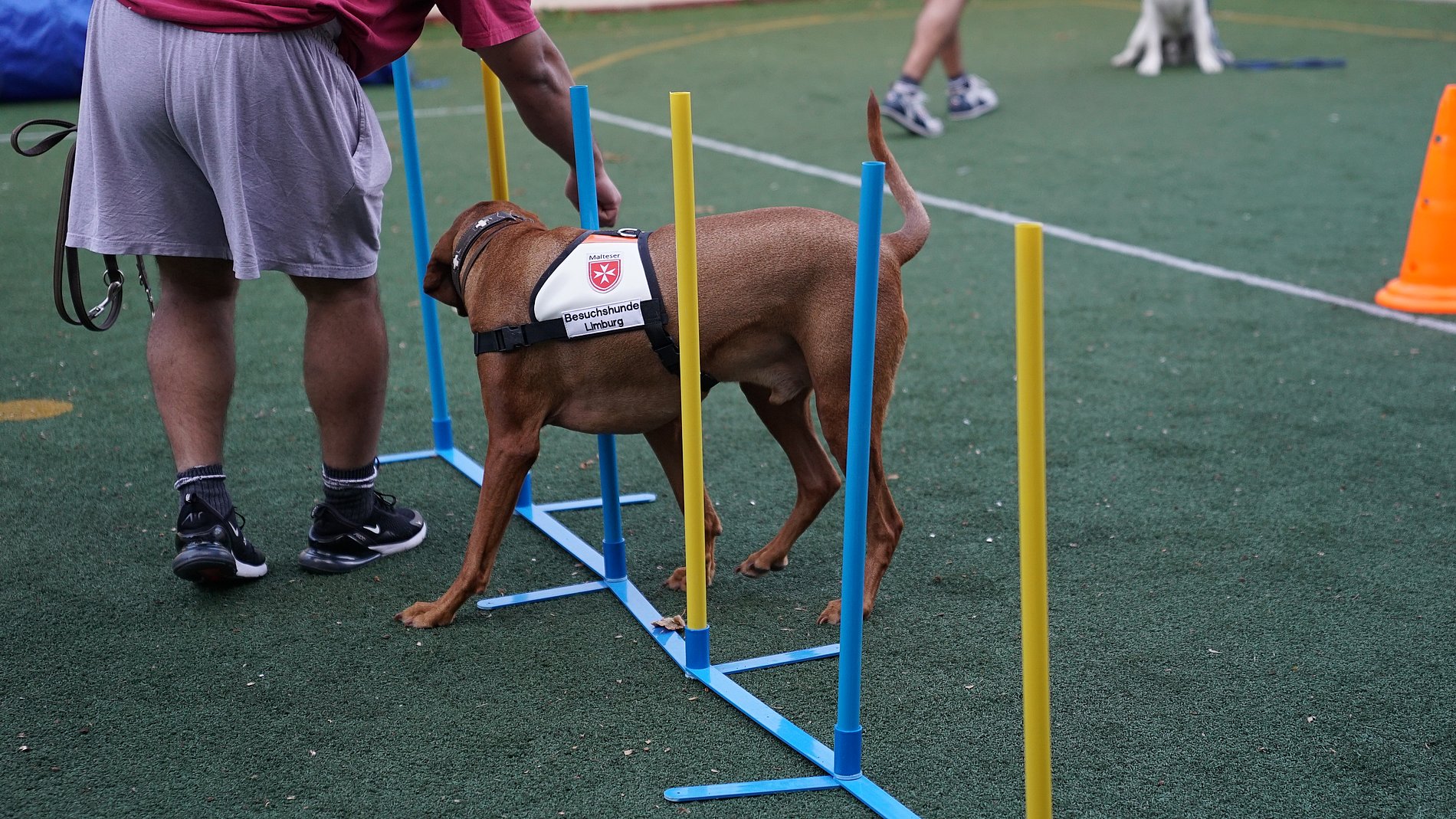 „Wenn du ein bisschen Futter in die Hand nimmst, klappt es bestimmt besser. Das ist ein Labrador, Essen geht da immer“, ruft Lisa Bill von den Maltesern dem Insassen der Justizvollzugsanstalt (JVA) Limburg zu. Er versucht gerade, mit Hund Bailey im Slalom um die anderen Hunde herumzulaufen. Doch der verspielte Labrador mit beigem Fell läuft immer wieder woanders hin. Bis der Inhaftierte in seine Tasche greift und ihn mit Leckerlis ködert. Plötzlich weicht ihm Bailey nicht mehr von der Seite.
