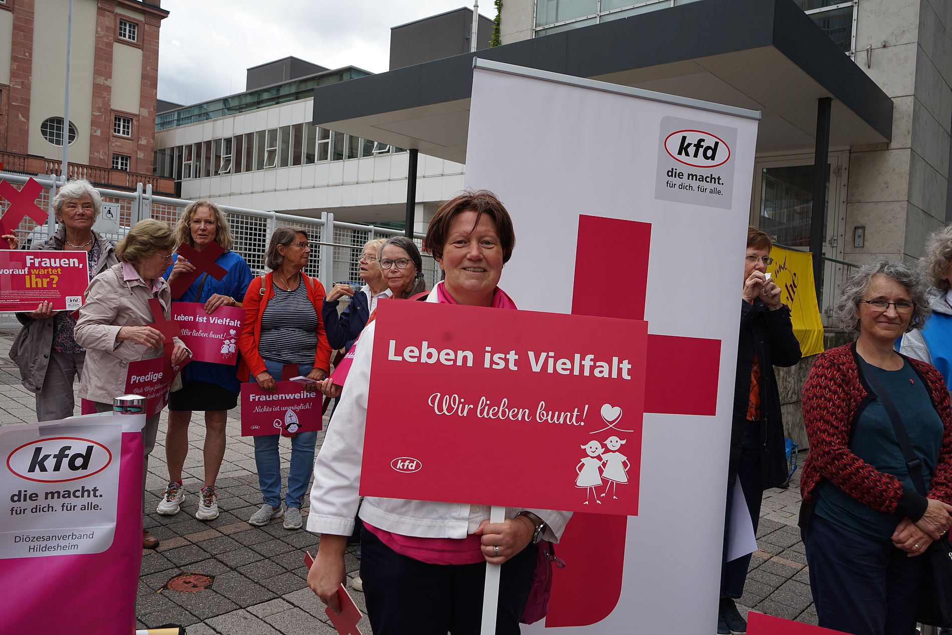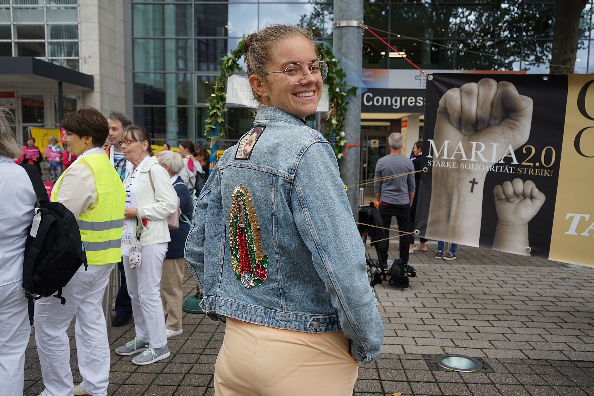 Antonia Papenfuhs ist immer dabei. Die junge Frau, die stets mit einer mit Marienmotiv bestickten Jacke oder Tasche zu den Protesten kommt, ist seit der ersten Vollversammlung vor zweieinhalb Jahren ein beliebtes Fotomotiv für die Presse. Das liegt nicht nur daran, dass sie mit 22 deutlich jünger ist als die anderen Frauen, die hier für „Gleiche Rechte, gleiche Würde“ demonstrieren. Die überzeugte Katholikin studiert evangelische Theologie, um Pfarrerin zu werden – eine spannende Geschichte, die schon in verschiedenen Medien aufgegriffen wurde. Die Studentin gibt zu, dass sie diesmal kurz überlegt hat, ob es eigentlich Sinn macht, sich wieder vor’s Congress Center zu stellen: „Aber ich hoffe immer noch, dass sich in dieser Kirche etwas tut und dass Hürden überwunden werden können.“