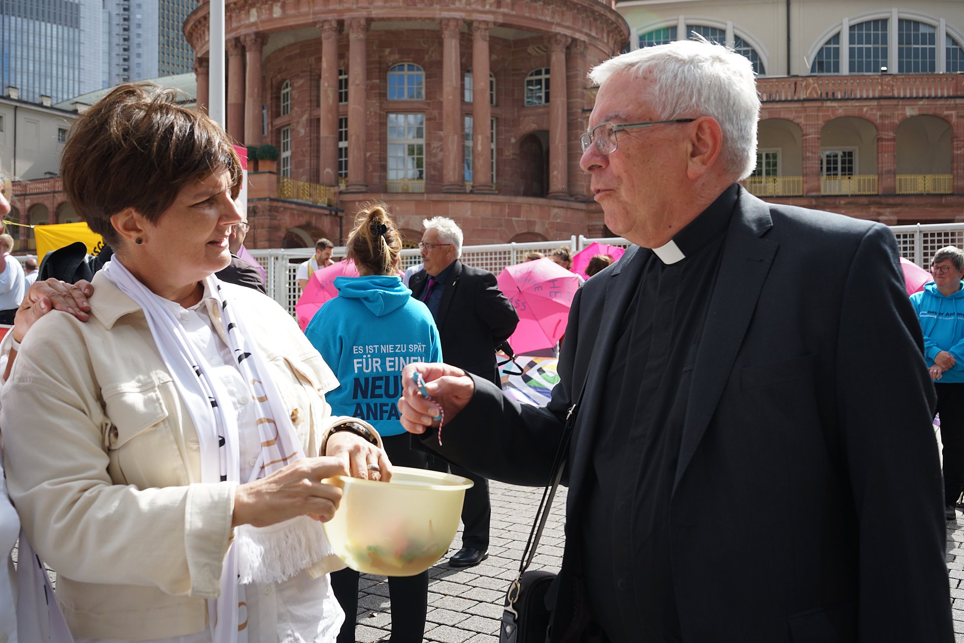 Nicht alle reagieren aufgeschlossen auf das freundliche Angebot – viele Bischöfe gehen vorbei, sich freundlich entschuldigend, dass sie sich beeilen müssten. Ob das wirklich der einzige Grund ist, den Segen auszuschlagen? Die beiden Präsidenten des Synodalen Weges, Bischof Georg Bätzing und Irme Stetter-Karp, hingegen bleiben interessiert stehen – und lassen sich schließlich auch einen Segen geben, sehr zur Freude von Marianne Brandt. Auch Pfarrer Werner Otto und einige weitere lassen sich segnen. Ein ungewohntes Gefühl für Marianne Brandt. „Uns geht es darum zu zeigen, was wir sind: durch die Taufe vollwertige Mitglieder der Kirche“, erklärt sie die Aktion.