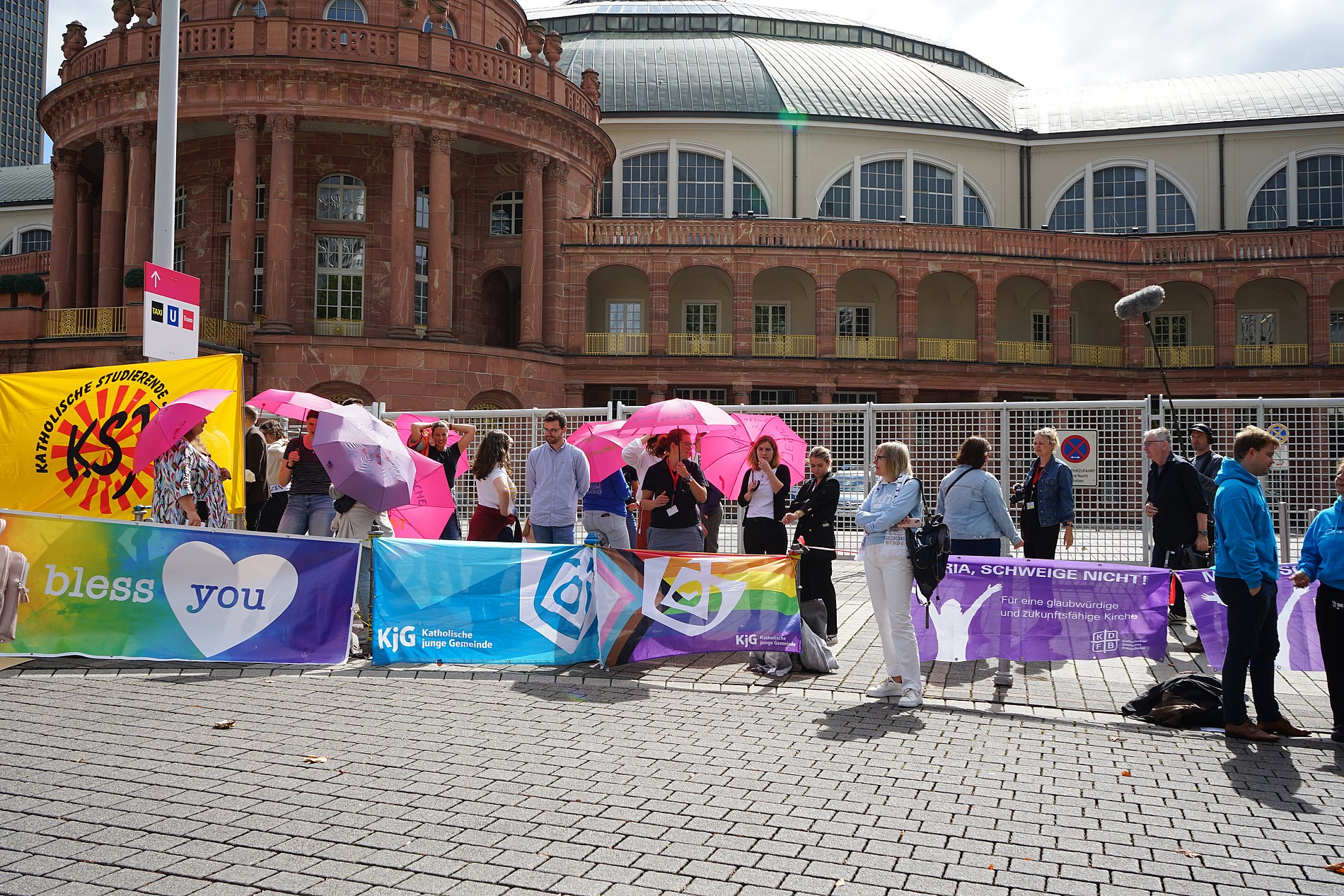 Vor Beginn der vierten Synodalversammlung haben Maria 2.0 und andere Gruppen erneut vor dem Congress Center an der Frankfurter Messe protestiert. Das hat schon Tradition – und doch hat sich seit der ersten Demo viel verändert.