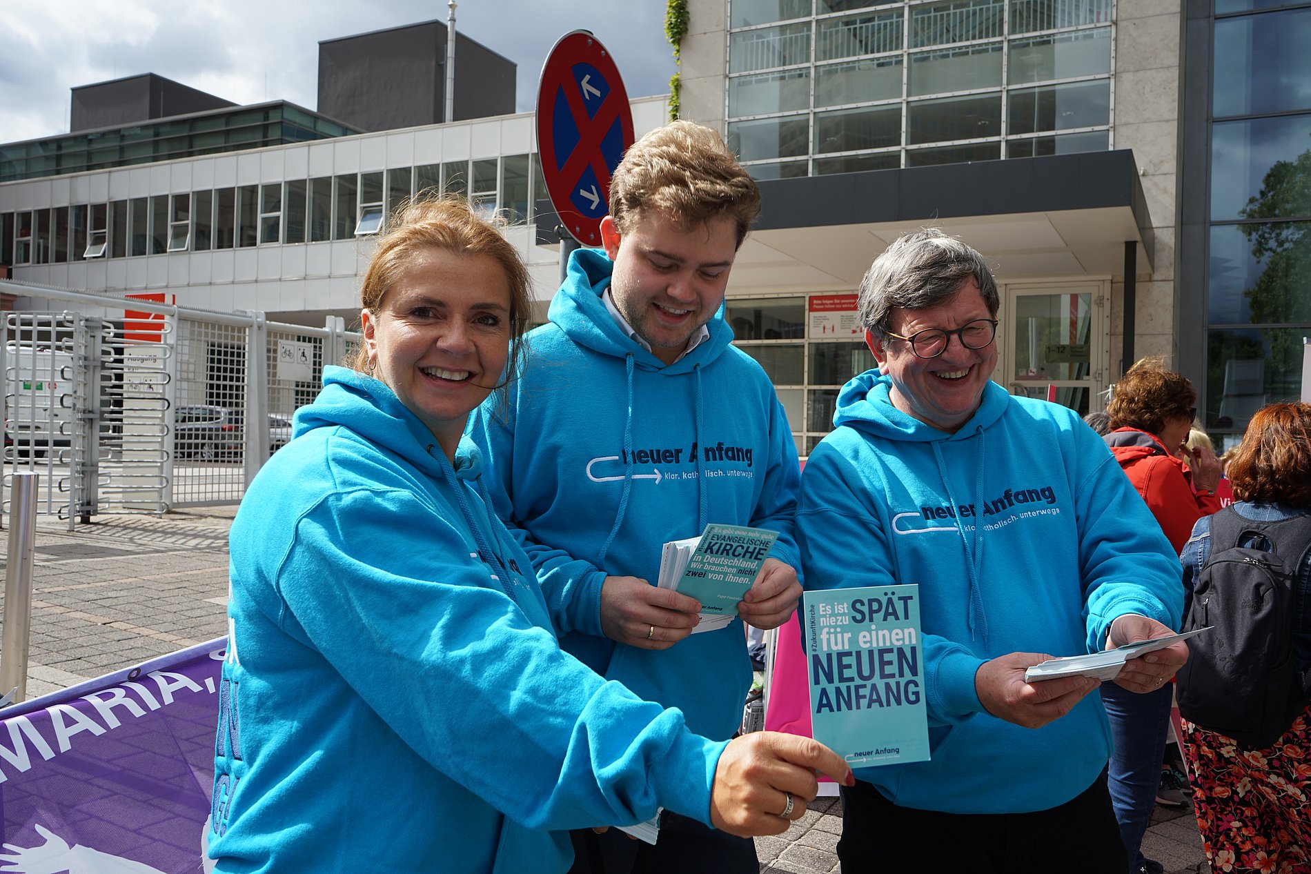 Mit zahlreichen Vertreterinnen aus ganz Deutschland angereist ist der Katholische Frauengemeinschaft Deutschlands (KFD). Diözesanreferentin Susanne Winnekens-Udovic aus dem Bistum Limburg sagt: „Ich möchte gerne zuversichtlich bleiben und hoffen, dass bestimmte Entscheidungen, die der Synodale Weg trifft, lokal umsetzbar sind.“ Die Theologin und die anderen KFD-Frauen halten pinke Schilder hoch mit Forderungen wie „Frauenweihe – nichts ist unmöglich!“ und „Licht ins Dunkel bringen!“. Das wollen auch Birgit Kelle, Michael Bischoff und Peter Esser von der Initiative „Neuer Anfang“, die in ihren blauen Kapuzenpullovern deutlich aus der Menge herausstechen. Sie fordern: „Der Synodale Weg sollte sich mit der Aufarbeitung der Missbrauchskrise befassen, denn dafür wurde er ins Leben gerufen. Und nicht mit Fragen wie zum Beispiel, wer wen heiraten darf.“ Konkret fordern sie, das Thema Missbrauch von den anderen Themen abzuspalten und vorwiegend zu behandeln. „Viele, die an der Aufarbeitung beteiligt sind, sind auch Teil des Problems“, kritisiert Brigit Kelle. „Hier sollte nicht über systemische, sondern über persönliche Probleme gesprochen werden. Es müssen Köpfe rollen!“