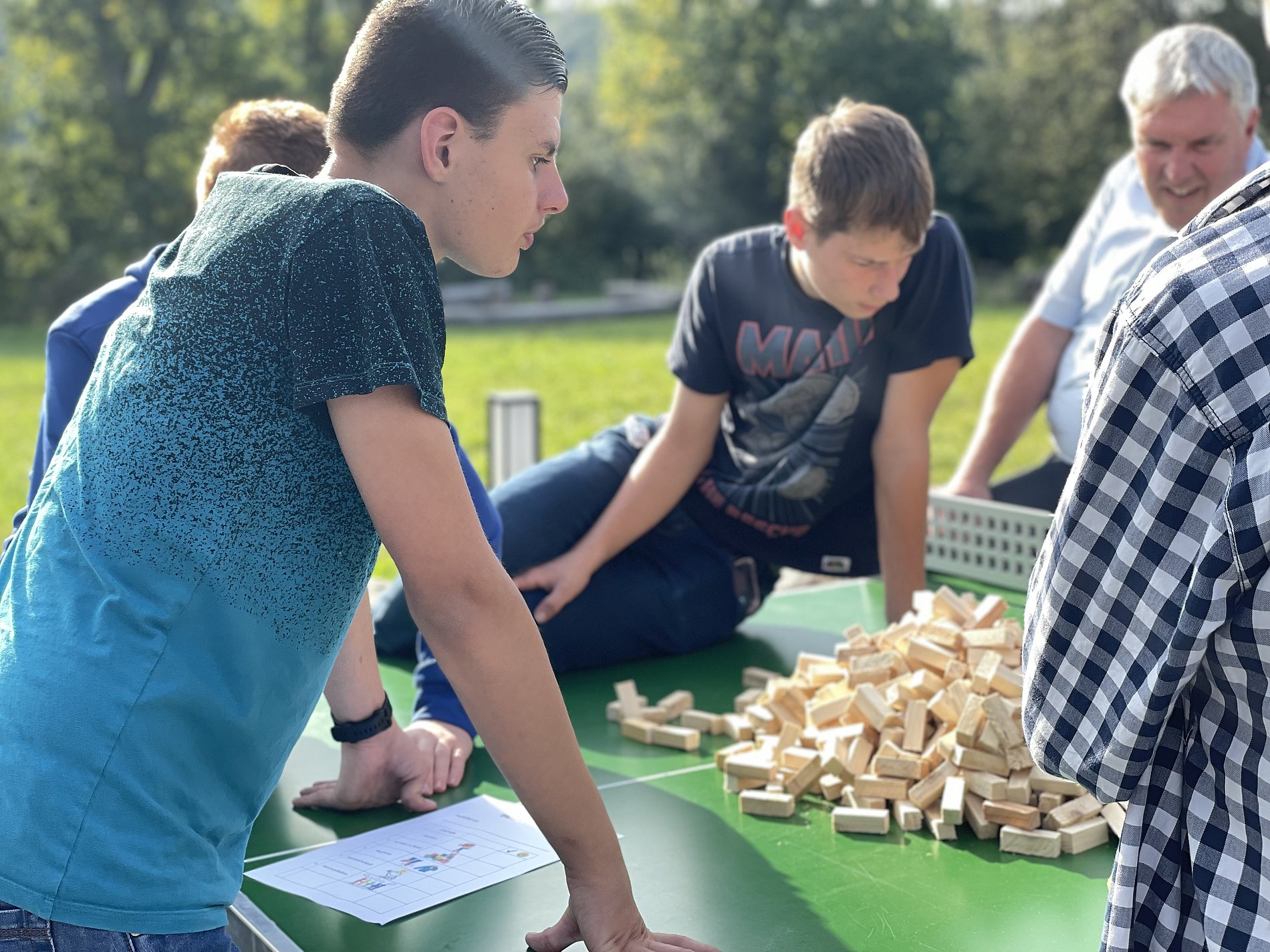 Um dieses Ziel zu erreichen, wurden während der Begegnungstage auch Spiele gespielt, die Vertrauen aufbauen und das Gemeinschaftsgefühl stärken. Die Schülerinnen und Schüler absolvierten gemeinsam verschiedene Stationen im Erlebnisparcours, die sie nur gemeinsam bewältigen konnten. Unter anderem führten sie sich blind über das Außengelände des Hildegardishofs und versuchten, einen möglichst hohen Turm aus Holzsteinen zu bauen. „Wir unterstützen uns hier gegenseitig und das ist total cool“, sagt Gloe. Abends saßen die Jugendlichen dann gemeinsam am Lagerfeuer, sangen Lieder und grillten Marshmallows.