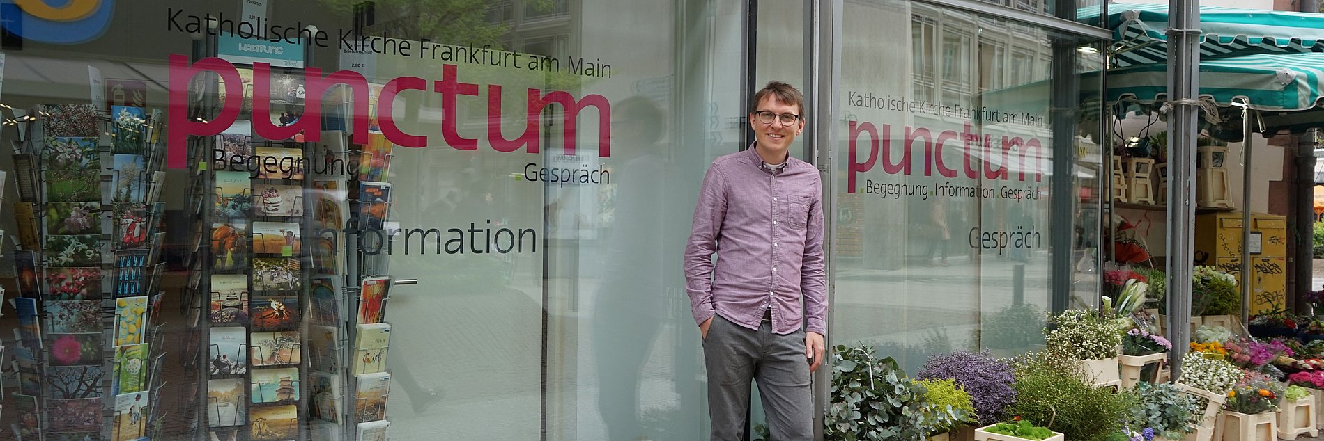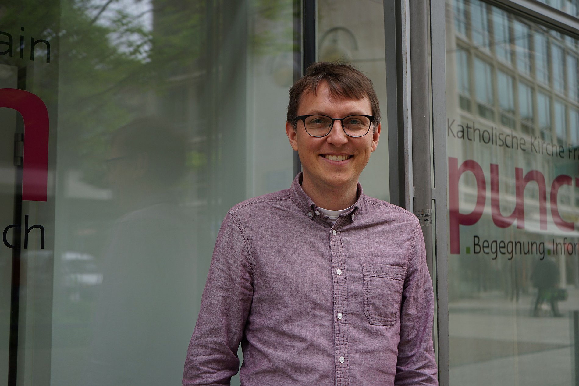 Interessiert, aufgeschlossen und nicht so leicht aus der Ruhe zu bringen – so beschreibt sich Tobias Dera, neuer Leiter der citypastoralen Einrichtung Punctum in der Innenstadt. Es sind Eigenschaften, die bei der neuen Aufgabe hilfreich sein werden. Denn im Punctum, das mit seinem kleinen Café in einem hellen, freundlichen Glasbau direkt in der belebten Liebfrauenstraße untergebracht ist, herrscht stets viel Betrieb. Menschen kommen und gehen, trinken einen Kaffee an der Theke, wünschen sich ein Gespräch, wenden sich mit dem Gedanken eines Wiedereintritts in die Kirche ans Team oder wollen sich informieren über kirchliche Angebote und Veranstaltungen.