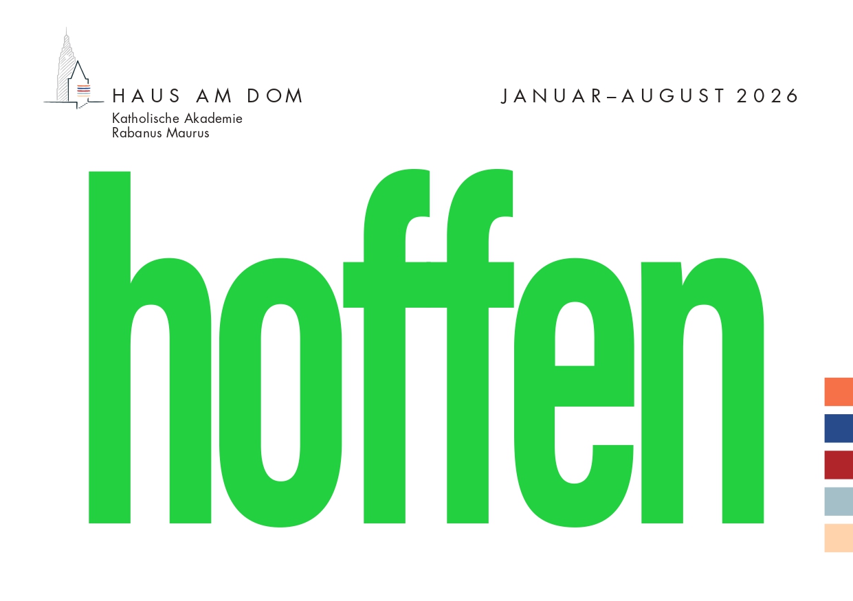 hoffen: das steht in riesigen Buchstaben auf dem Programmheft der Katholischen Akademie Rabanus Maurus fürs erste Halbjahr 2026. Damit es auch wirklich gar keinen Zweifel an der Wucht des Wortes gibt, hat man sich bei der Farbgebung für Neongrün entschieden und die Buchstaben laufen Seitenbreit von Rand zu Rand. Die Botschaft: Hoffnung hat Wucht, Hoffnung ist Kraft.