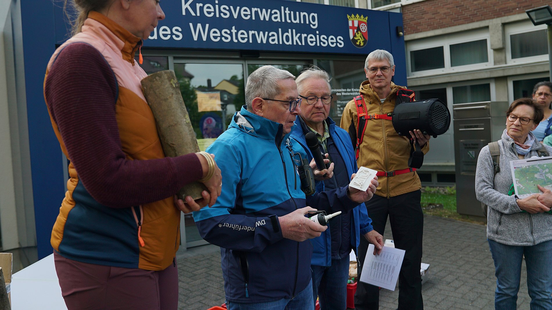 Nach einem kurzen Impuls von Georg Schmitz geht es dann los. Die acht Gruppen machen sich auf den Weg zu ihren Etappen. Die erste Gruppe besteht aus zehn Personen. Der Weg beginnt an der Klosterkirche in Dernbach und endet in Horressen – 4,5 Kilometer. Jede Gruppe hat einen Beutel mit Material dabei. Darin befinden sich Aufkleber und Schilder zur Kennzeichnung des Weges, Feuchttücher zum Reinigen des Untergrundes, zudem eine Drahtbürste, um die Rinde der Bäume etwas zu säubern. Beim ersten Aufkleber ist die Gruppe sich noch einig, an der ersten Weggabelung sieht es schon anders aus. Welcher Ort ist geeignet – lieber der Baum oder vielleicht doch die Straßenschilder?