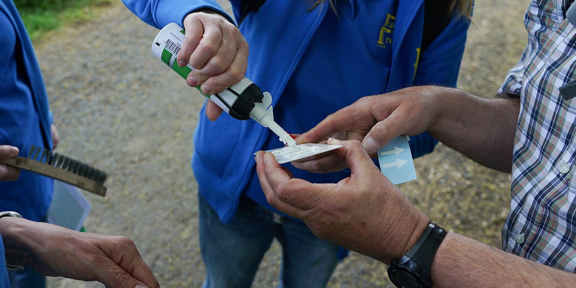 An diesem Samstag geht es darum, den künftigen Pilgerinnen und Pilgern den Weg kenntlich zu machen. Dazu teilen sich die Freiwilligen in insgesamt acht Gruppen auf. Jede Gruppe beschildert einen Teil des Pilgerwegs. Die Strecken sind zwischen 2,8 und 5,5 Kilometer lang. Beschildert werden muss in beide Richtungen. Eberhard Ullrich vom Westerwaldverein ist zuständig für die Wege im Westerwald. Er erklärt, worauf bei der Beschilderung eines Weges geachtet werden muss. „Wichtig ist, dass der Wanderer später den Weg findet“, sagt er. „Wir markieren auf Sicht, heißt also: von beiden Seiten und immer 90 Grad versetzt, damit die Markierung zu sehen ist. Damit die Markierungen halten, sollte der Untergrund sauber sein.“ Dazu nutzen die Teilnehmerinnen und Teilnehmer ein Zieheisen, um die Rinde zu glätten, oder eine Bürste, um den Untergrund zu säubern. „Immer genug Kleber drauf“, rät Ullrich – viel hilft viel.
