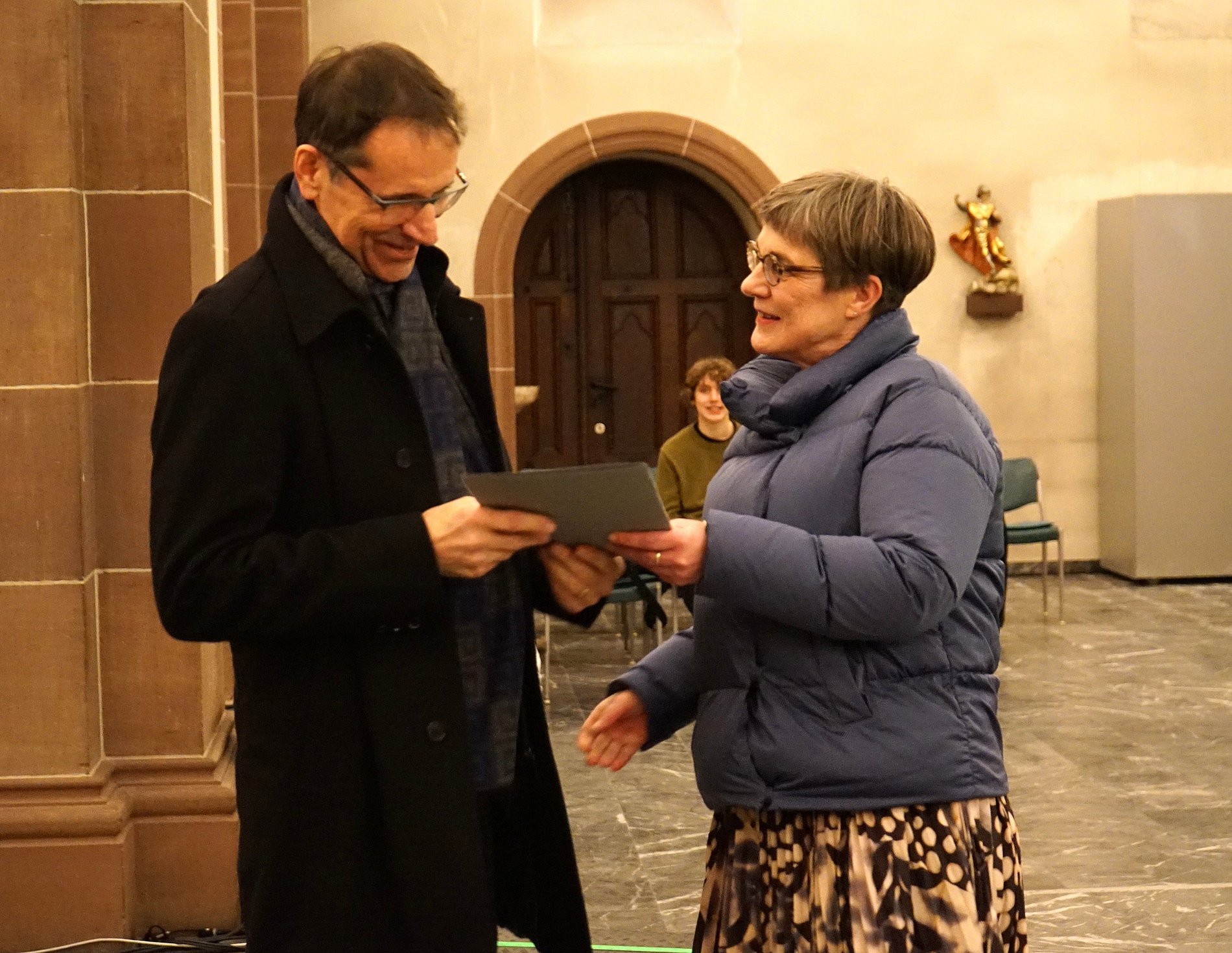 Prof. Dr. Hildegard Wustmans, Bischöfliche Beauftragte des Bistums Limburg, überreichte Linden die Verabschiedungsurkunde. Durch seine verlässliche Unterstützung und sein gutes ökumenisches Wirken habe er die Telefonseelsorge zu einer geprägten Marke gemacht, so Wustmans.