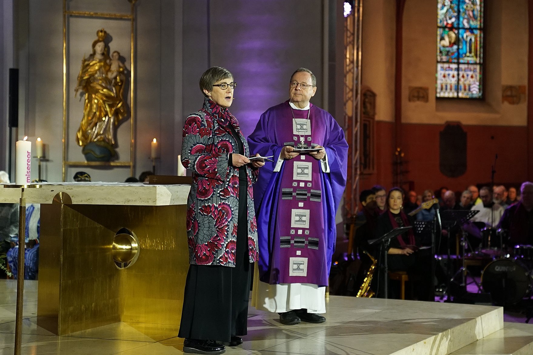 In solchen Zusammenhängen könne es hilfreich sein, einen Blick in die Bibel zu werfen. Auf das Entweder-oder-Spiel des Teufels lasse Jesus sich nicht ein, sondern kontere mit Größen, die darüber hinaus gingen. „Kein Mensch lebt vom Brot allein, Gott – Jahwe – ist nicht zu versuchen, Gott allein – elohim – soll man dienen. So widersteht Jesus den Versuchungen und verbindet sich mit Gott und der Welt. Das schenkt Perspektive“, sagte Bätzing. Es ermögliche einen Neuanfang. „Das heißt: Es ist noch nicht alles festgelegt. Wir können neu anfangen. Weil wir Menschen sind, können wir immer wieder anfangen“, sagte Hildegard Wustmans und zitierte damit die Publizistin Hannah Arendt. „Wo diese Fähigkeit unterdrückt wird, Menschen nicht die Möglichkeit haben, dies auszuleben, werden Zukunft und Möglichkeitssinn genommen“, sagte Wustmans.