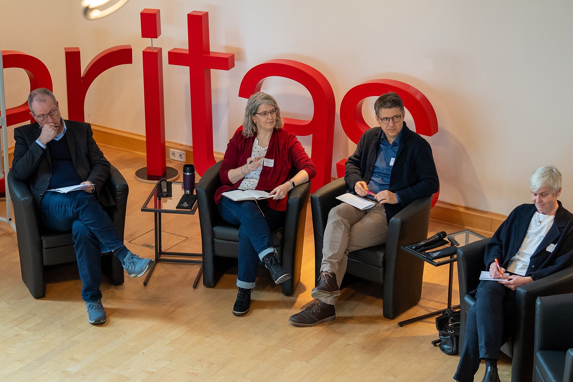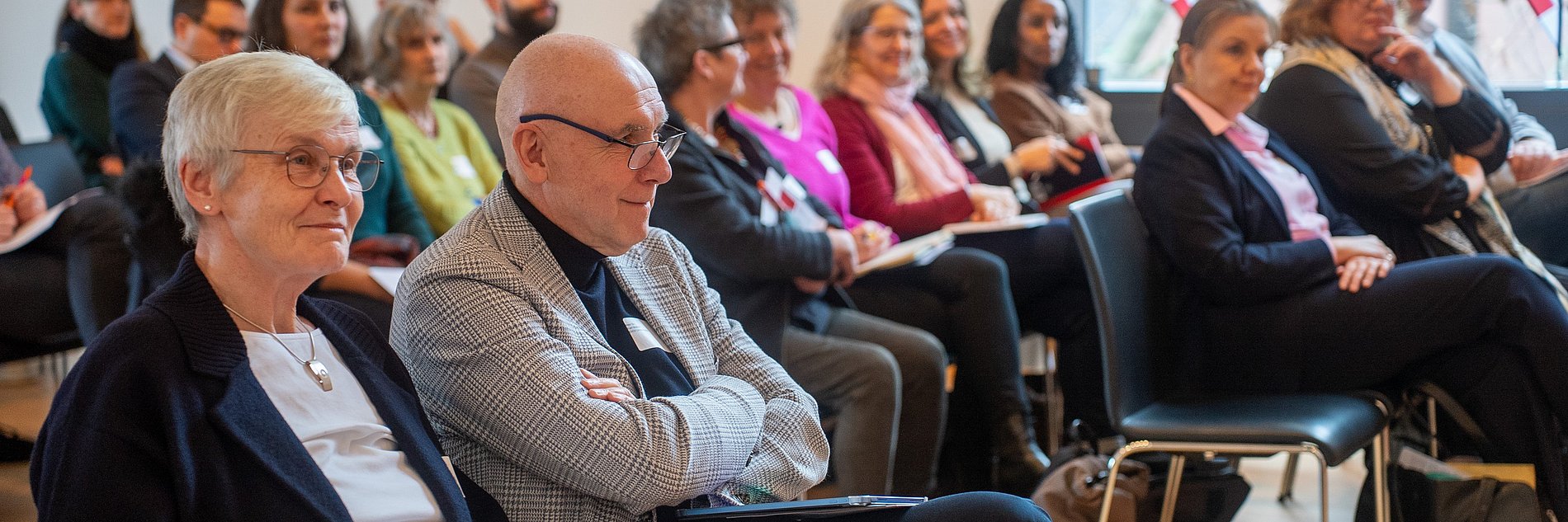 In der abschließenden Podiumsdiskussion mit den Vortragenden Ursula Wollasch und Bernhard Bleyer sowie Kerstin Fuchs (Geschäftsführerin des Jugendhilfezentrums Johannesstift GmbH, Wiesbaden) und Caspar Söling (Sprecher der Geschäftsführung der Stiftung Sankt Vincenzstift Aulhausen) setzten letztere mit ihrer praktischen Leitungserfahrung eigene Akzente. Während Fuchs den Blick auf die Führungsverantwortung für einen wertschätzenden Umgang mit den Mitarbeitenden in den Einrichtungen und Diensten der Caritas lenkte, forderte Söling unter anderem mehr Selbstbewusstsein in einer positiven Akzeptanz der christlichen Prägung als Ressource. Aus dem Publikum wurde dagegen auf die Erfahrungen langjähriger Mitarbeitenden auf die Selbstwidersprüche zwischen kirchlichem Anspruch und Wirklichkeit in der alten Grundordnung hingewiesen, die immer noch weiterwirkten.