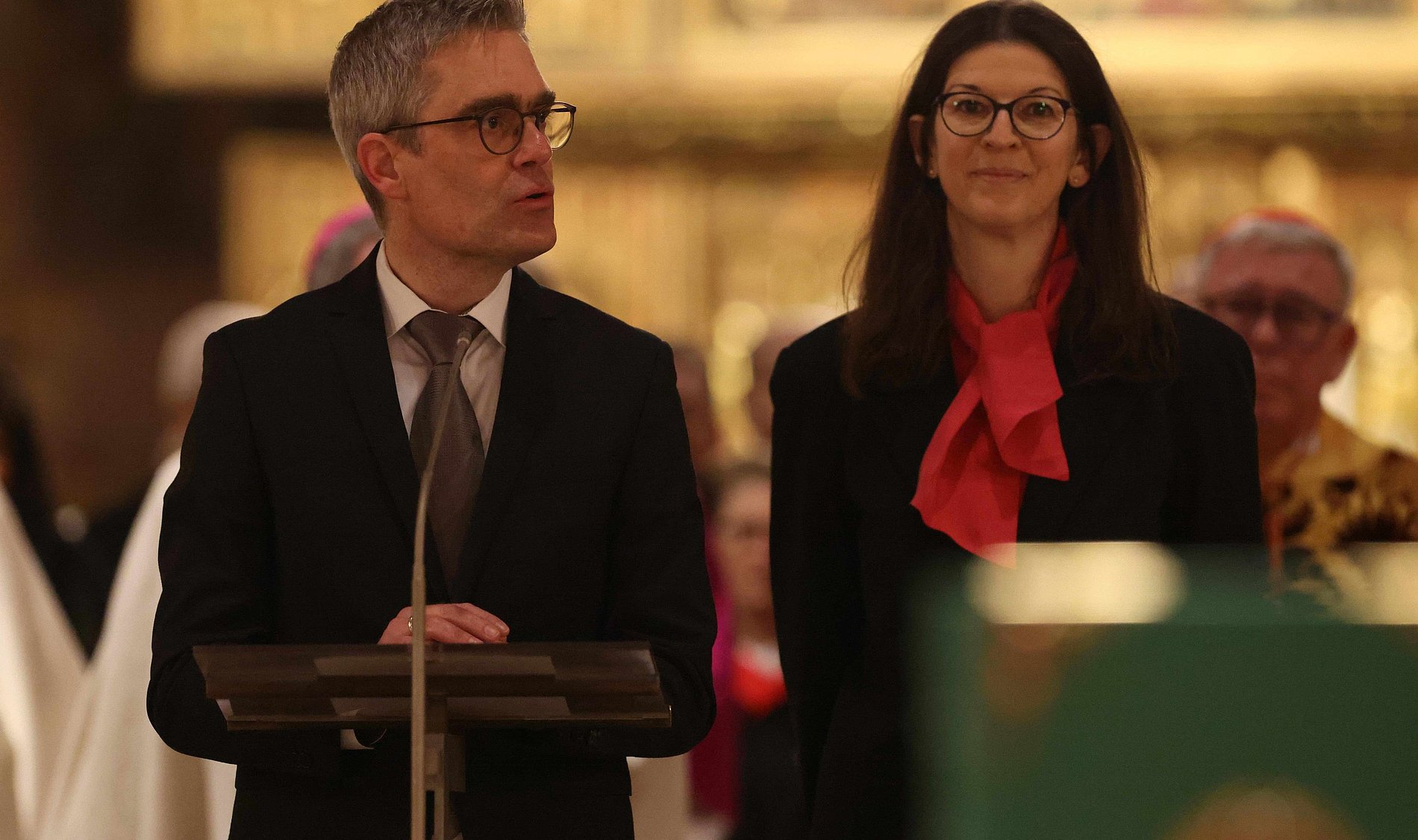 Christiane Moser-Eggs und Michael Thurn, die die katholische Stadtkirche Frankfurt in Doppelspitze leiten, begrüßten im vollbesetzten Dom. „Mit dem Karlsamt stellen wir uns heute aufs Neue in eine lange Tradition“, sagte Christiane Moser-Eggs. „Dass wir Karls des Großen im Gottesdienst an diesem Ort gedenken, geht weit zurück. In unserem Feiern erinnern wir uns aber nicht nur daran, wo wir herkommen. Im Bewusstsein unserer Herkunft und Tradition sind wir herausgefordert, Gegenwart und die Zukunft zu gestalten. Und zwar anhand heutiger Themen und Fragen. Unser Singen und Beten ist Ausdruck davon. Es ist getragen von dem Glauben, dass Gott dabei an unserer Seite ist und es auch in Zukunft bleibt.“ Michael Thurn begrüßte die Vertreterinnen und Vertreter der Stadt Frankfurt, der der Dom als sogenannte Dotationskirche gehört, und sagte, die Stadtkirche sei sehr dankbar, dass die Stadt ihn nutzbar mache. Auch die enge ökumenische Verbundenheit hob er hervor und begrüßte namentlich den evangelischen Stadtdekan Holger Kamlah mit allen anderen Vertreter:innen der christlichen Konfessionen. Auch Mitglieder des Rates der Religionen waren in den Dom gekommen, um beim Karlsamt dabei zu sein.