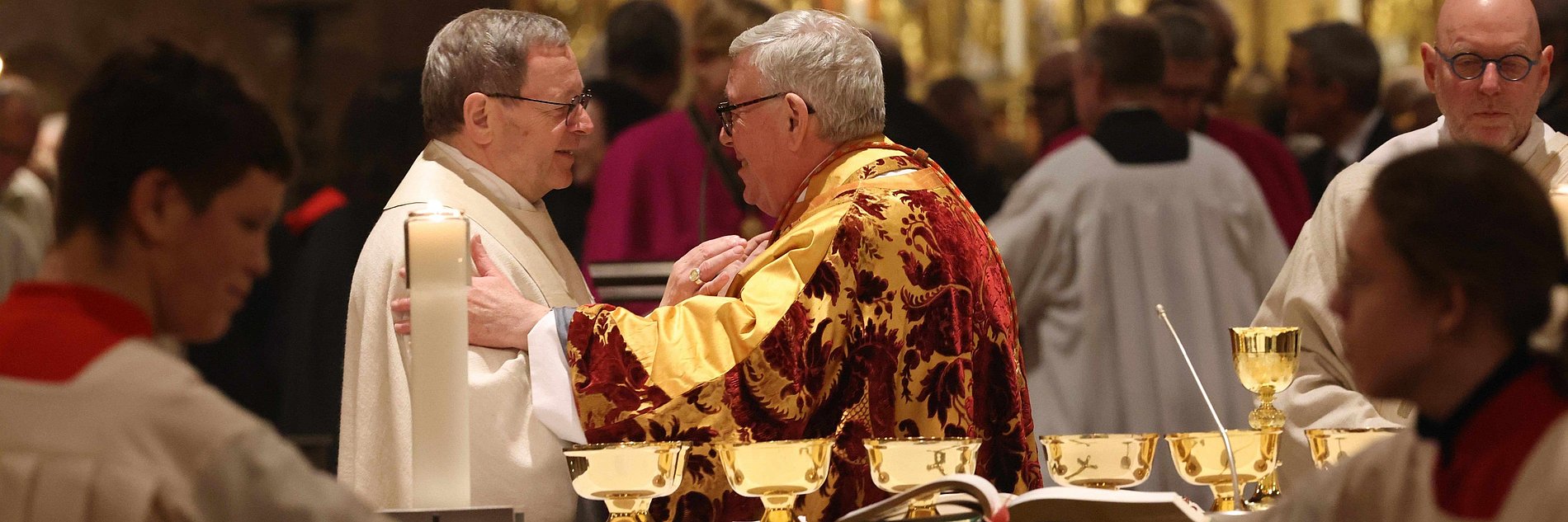 Frankfurts Dom ist dem Gastbischof nicht fremd, daran erinnerte der Limburger Bischof Dr. Georg Bätzing zu Beginn der feierlichen Messe, die mit ihren traditionellen lateinischen Gesängen stets einen Höhepunkt Ende Januar markiert. „Kardinal Hollerich war im Jahr 1989 vier Monate Diakon hier am Frankfurter Dom“, erklärte Bätzing. „In der Zeit des Studiums hat er auch das Karlsamt bereits miterlebt, deshalb ist das, was heute Abend geschieht, nichts, was von außen kommt.“ Jean-Claude Hollerich studierte 1989 und 1990 an der philosophisch-theologischen Hochschule St. Georgen in Frankfurt und erhielt hier das Lizenziat der Theologie.