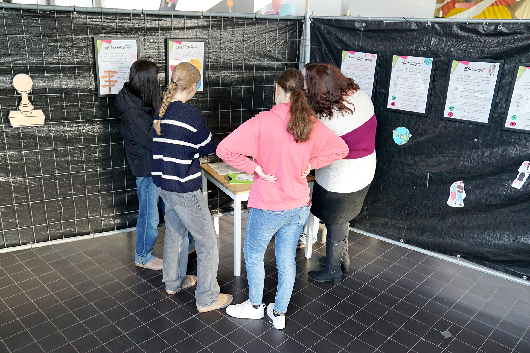 Während ihres Besuchs tauchten die Jugendlichen in ein groß angelegtes Planspiel ein: In Kleingruppen entwickelten sie zunächst einen fiktiven Charakter, dessen Lebensweg sie im Anschluss aktiv gestalteten. Auf einer Charakterkarte hielten sie Eigenschaften und Startbedingungen fest, bevor sie gemeinsam acht Lebenszonen durchliefen – vom Grundschulalter über Jugend- und Ausbildungszeit bis hin zum Berufseinstieg.