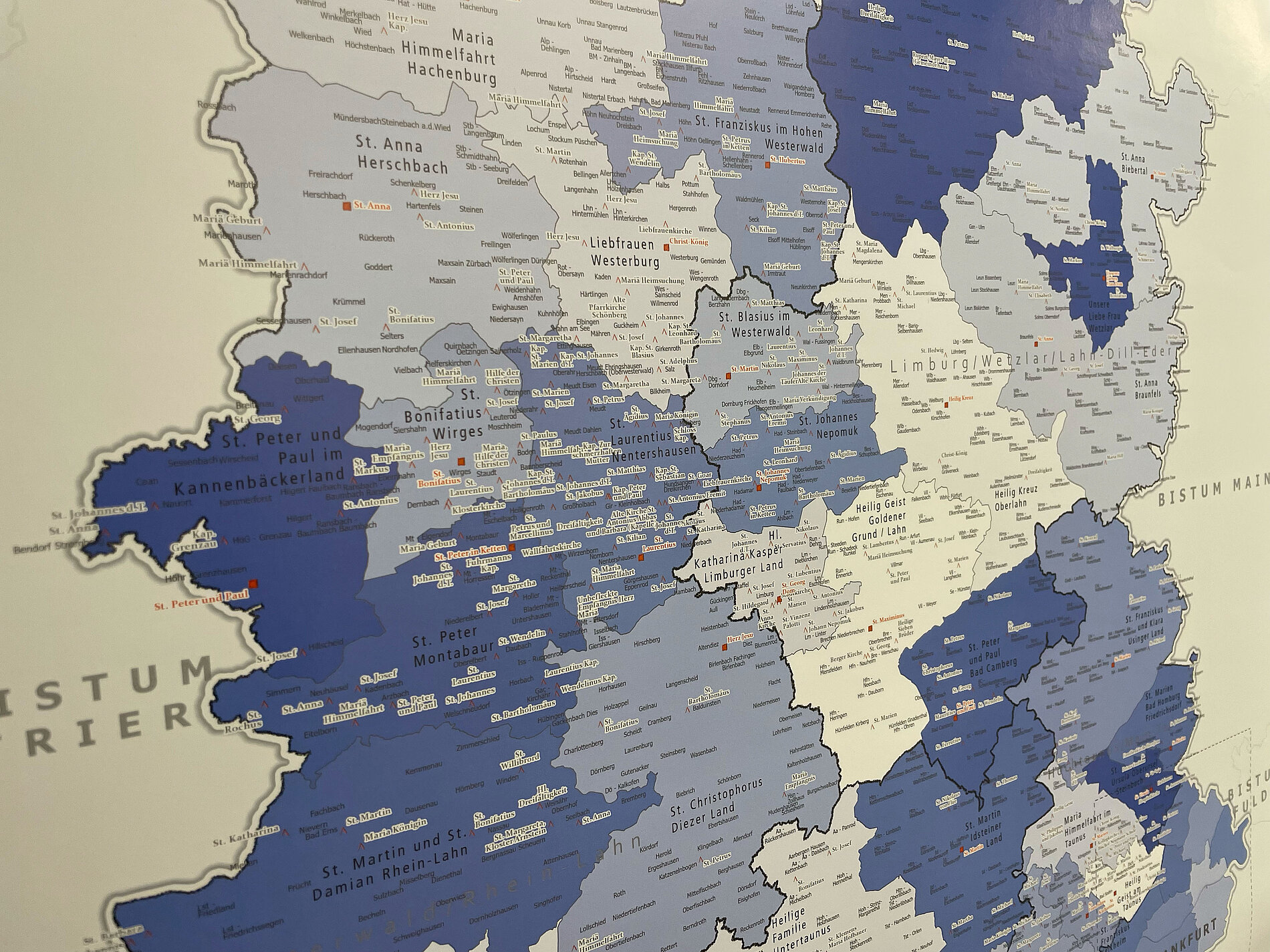 Zum Bistum Limburg gehören fünf Regionen und 47 Pfarreien, sowie 33 Gemeinden von Katholikinnen und Katholiken anderer Muttersprache.