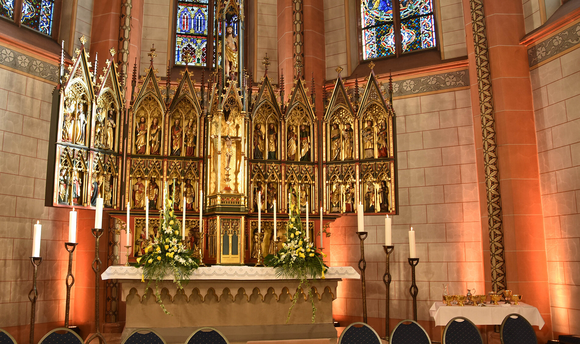 So wie die Kirche ist auch der Flügelaltar im Hochchor, der Allerheiligenaltar, im neugotischen Stil gestaltet.