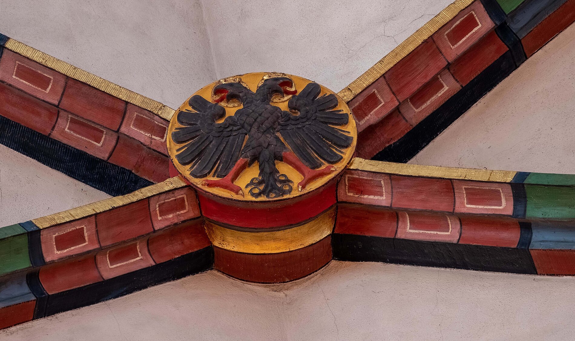 An den Kapitellen der Pfeiler sind zusätzlich goldene Weinblätter aufgemalt worden, um den Übergang zum gemalten Gewölbe aufzuwerten. 147.329,15 qcm Blattgold verteilen sich heute über die ganze Kirche.