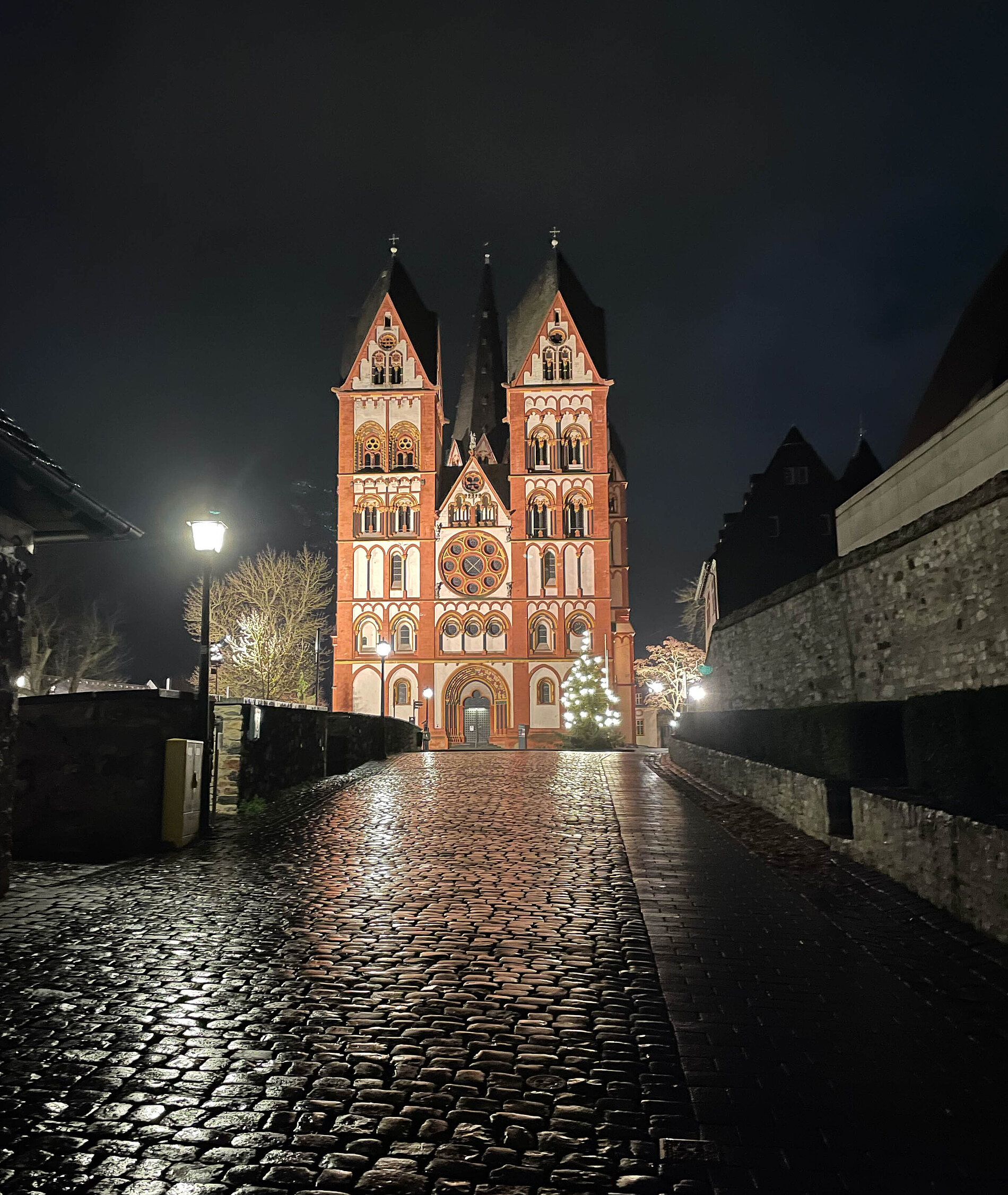 Der Standort des Limburger Domes ist herausragend: auf dem Felsen über der Lahn, weithin sichtbar. Limburg liegt seit jeher an einer wichtigen Verkehrsstraße. Deshalb ist der Dom für viele Menschen ein vertrautes Bild. Auch wenn riesige Brücken den Auto- und Zugreisenden fast schon von oben herab auf den Dom blicken lassen, bleibt der Anblick majestätisch. Und früher? Als der Weg noch an der Lahn entlangführte, müssen Felsen und Dom, auf die der Reisende hinaufgeschaut hat, wie eine Einheit gewirkt haben: wie ein Felsendom.