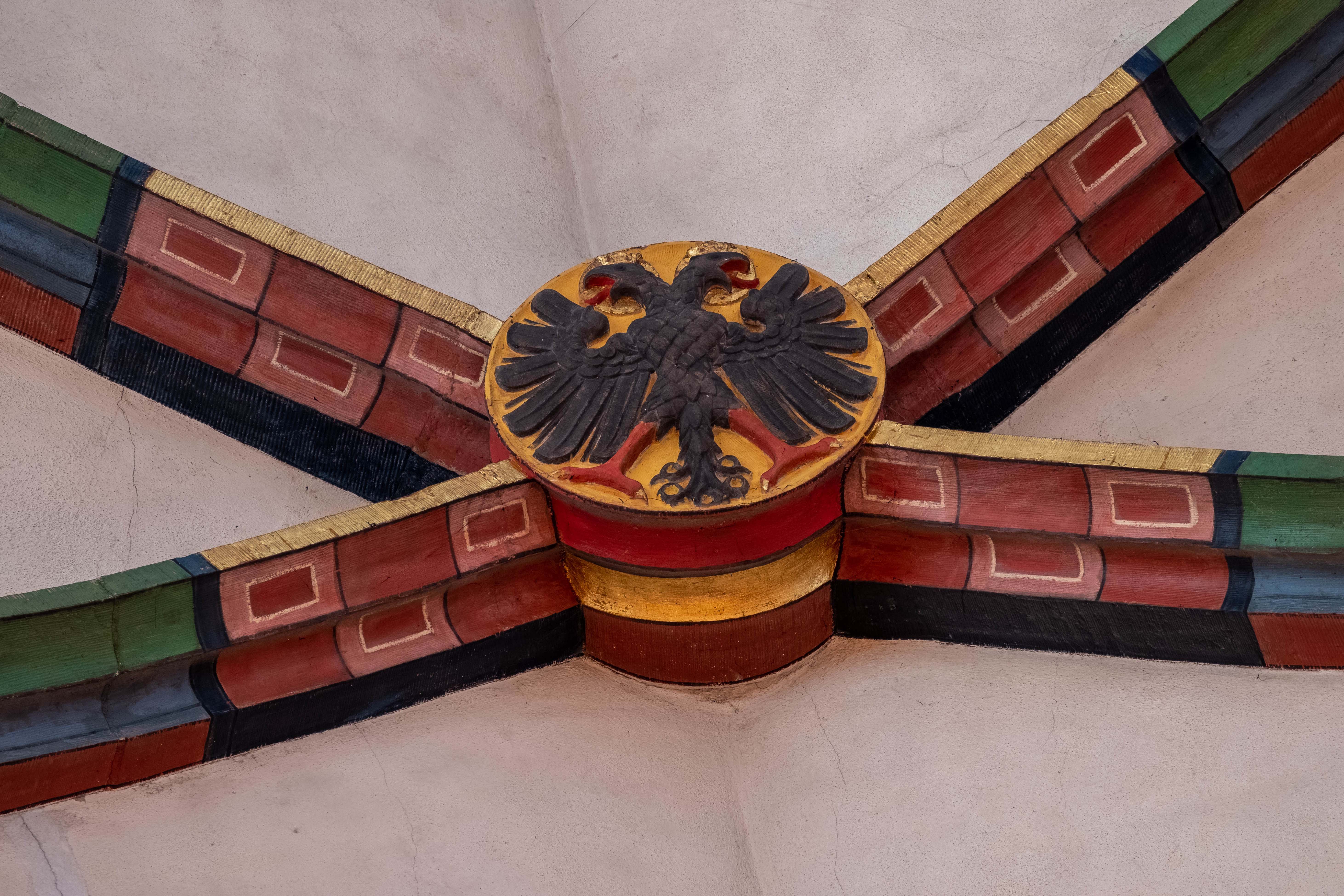 An den Säulen und Wänden des Erdgeschosses sind viele detailreiche Abbildungen angebracht, links und rechts vor der Vierung die Patrone Georg und Nikolaus. Hoch oben über der Vierung, die Pforte des Himmels symbolisierend, sind Georg und Nikolaus zu sehen, vereint mit Christus, dem Richter über die Lebenden und Toten.