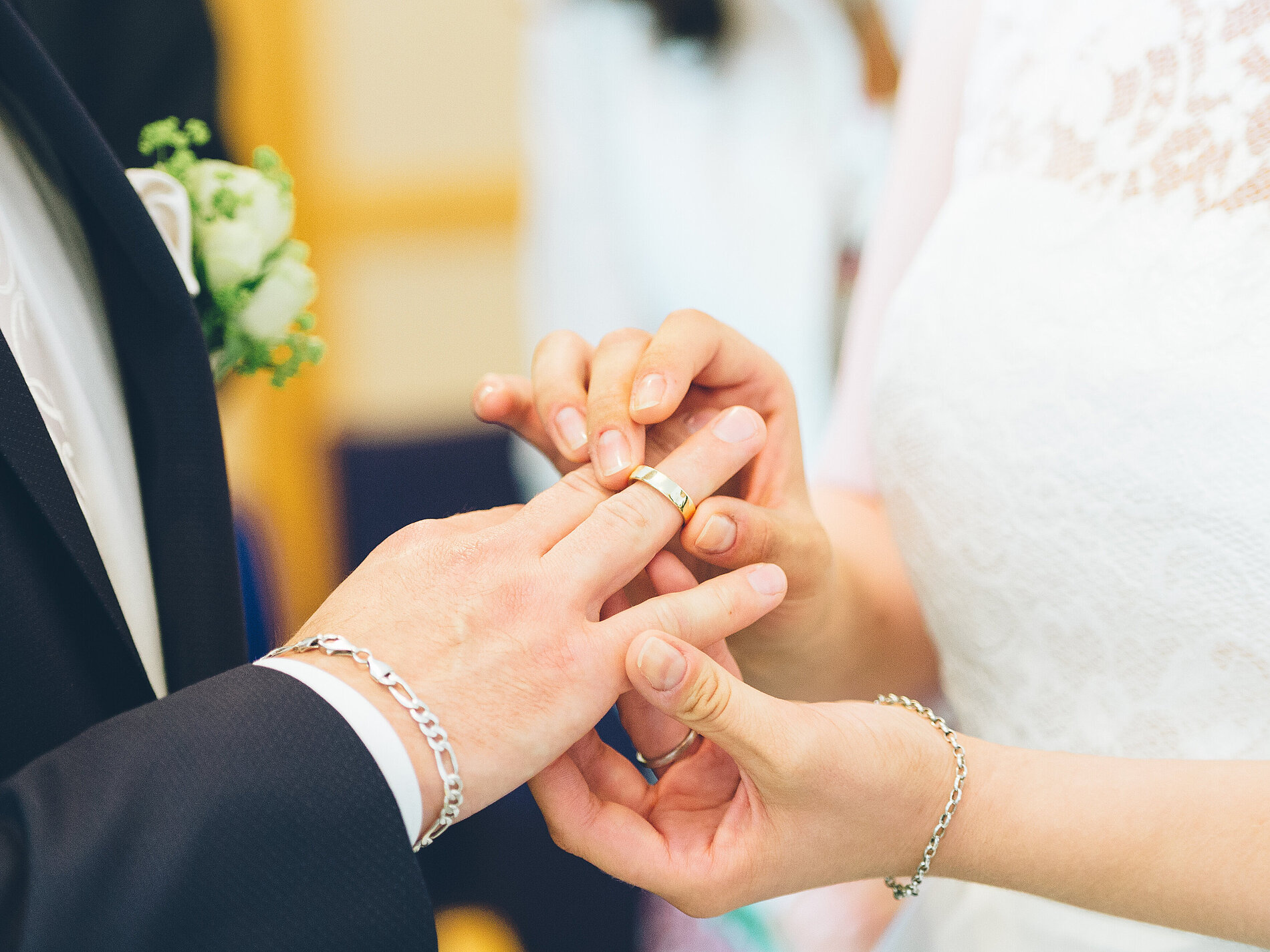 Mann und Frau stecken sich gegenseitig den Ehe-Ring an den Finger.