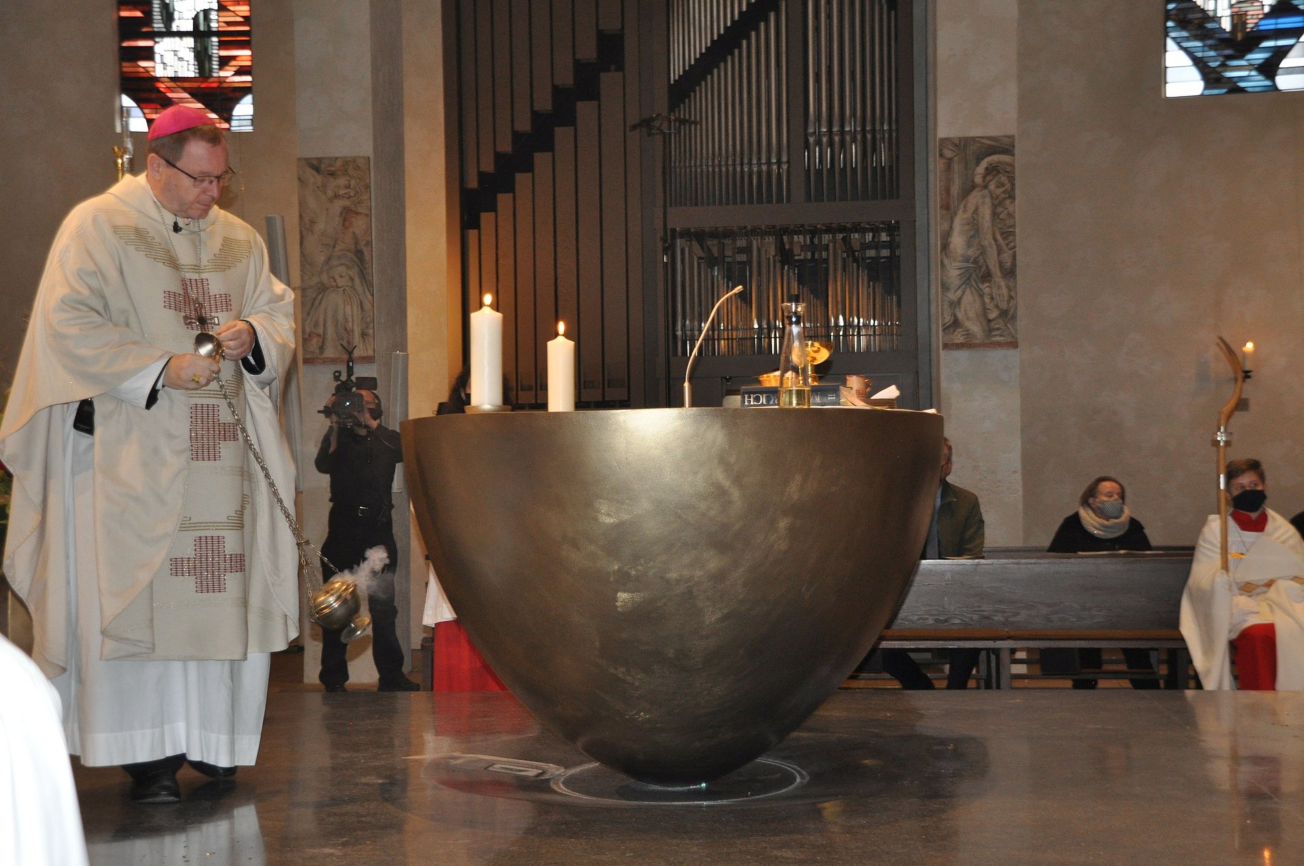 Für die Weihe besprengte der Bischof den Altar zunächst mit Weihwasser, anschließend rieb er die mit Messing legierte Oberfläche mit Chrisam ein. Dieser wird bei anderen Altarweihen durchaus auch schon mal direkt entzündet. Doch weil der neue Altar der Frauenfriedenskirche, besser gesagt die Tombak genannte Legierung, direktes Feuer nicht gut verträgt, verzichtete man darauf und wählte stattdessen die Variante mit den Feuerschalen. Während der Weihrauch brannte, betete Bischof Georg um Gottes Geist.