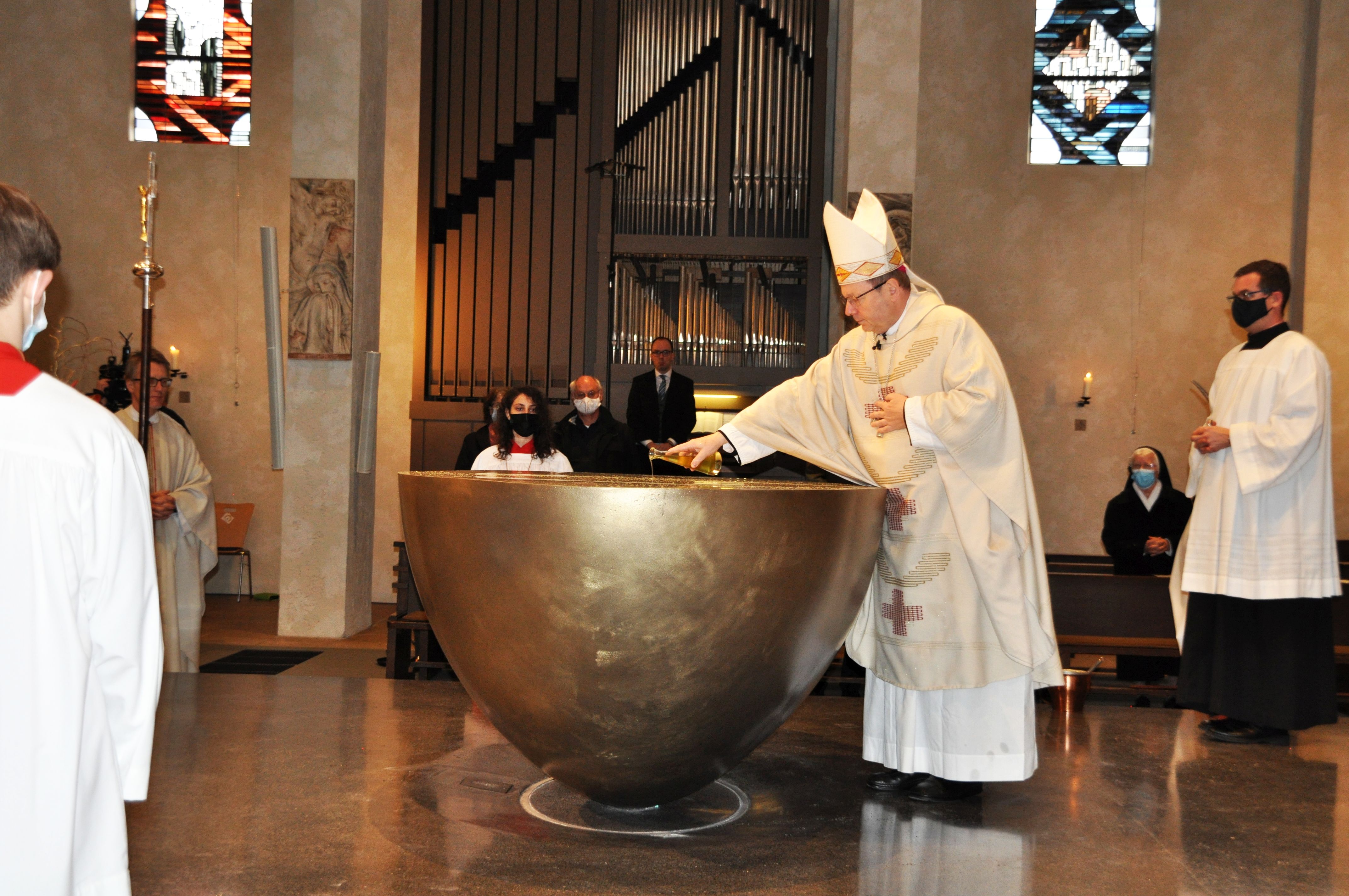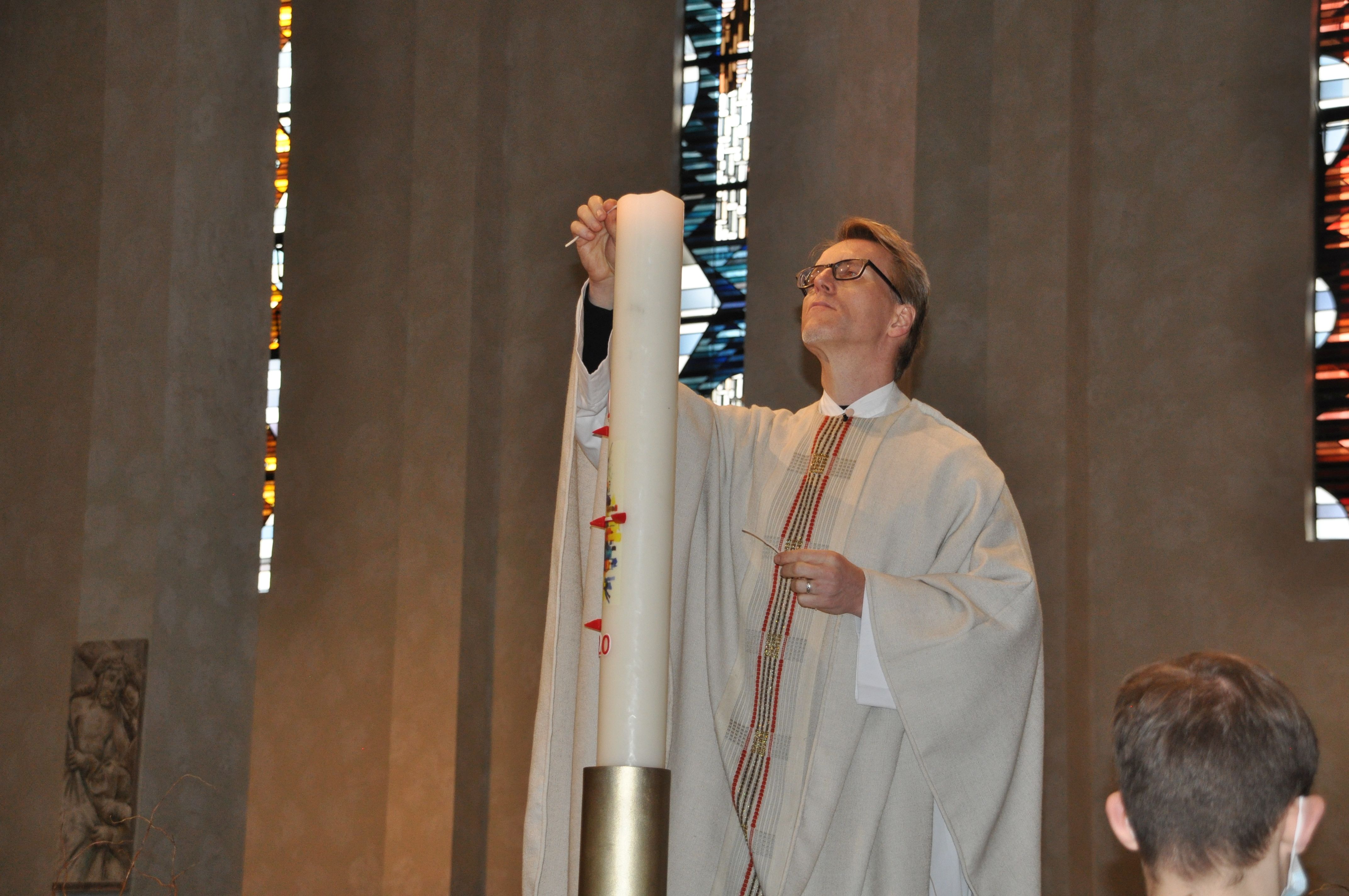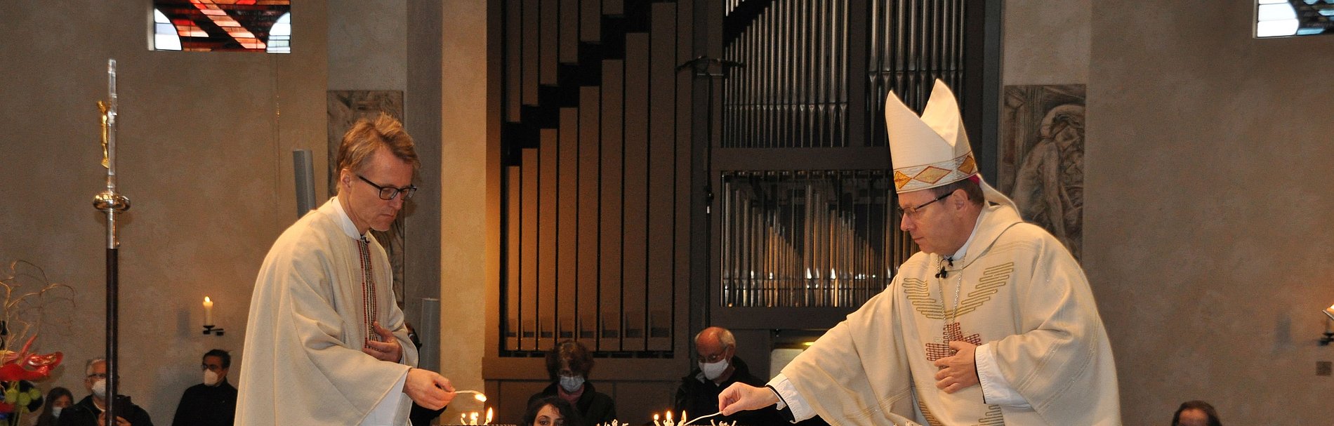 Mit einem entschlossenen Schritt und ernster Miene stieg Pfarrer Joachim Braun auf das Podest. Vorsichtig entzündete er einen Docht am Feuer der Osterkerze, dann trug er das Licht zum bereits mit Chrisam gesalbtem Altar. Gemeinsam mit Bischof Georg Bätzing entfachte der Pfarrer von Sankt Marien das Feuer in den fünf bereitstehenden Schalen und bedeckte sie anschließend mit Weihrauch, der sofort seinen würzigen Duft verbreitete. Ein feierlicher Moment in absoluter Stille, die schließlich vom Chorgesang der Schola Sankt Antonius Rödelheim unter Leitung von Annemarie Jacob abgelöst wurde. „Das berührt mich gerade sehr“, flüsterte eine Besucherin ihrem Mann zu. So wie ihr ging es an diesem Sonntagmorgen in Bockenheim und daheim vor den Bildschirmen sicher auch vielen anderen Menschen.